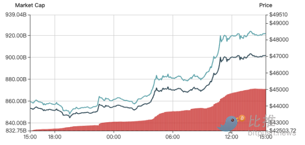 比推终端数据显示,美国东部时间 1 月 8 日下午 2:15 左右,比特币价格突破 47,000 美元。24 小时涨幅为 6.85%。