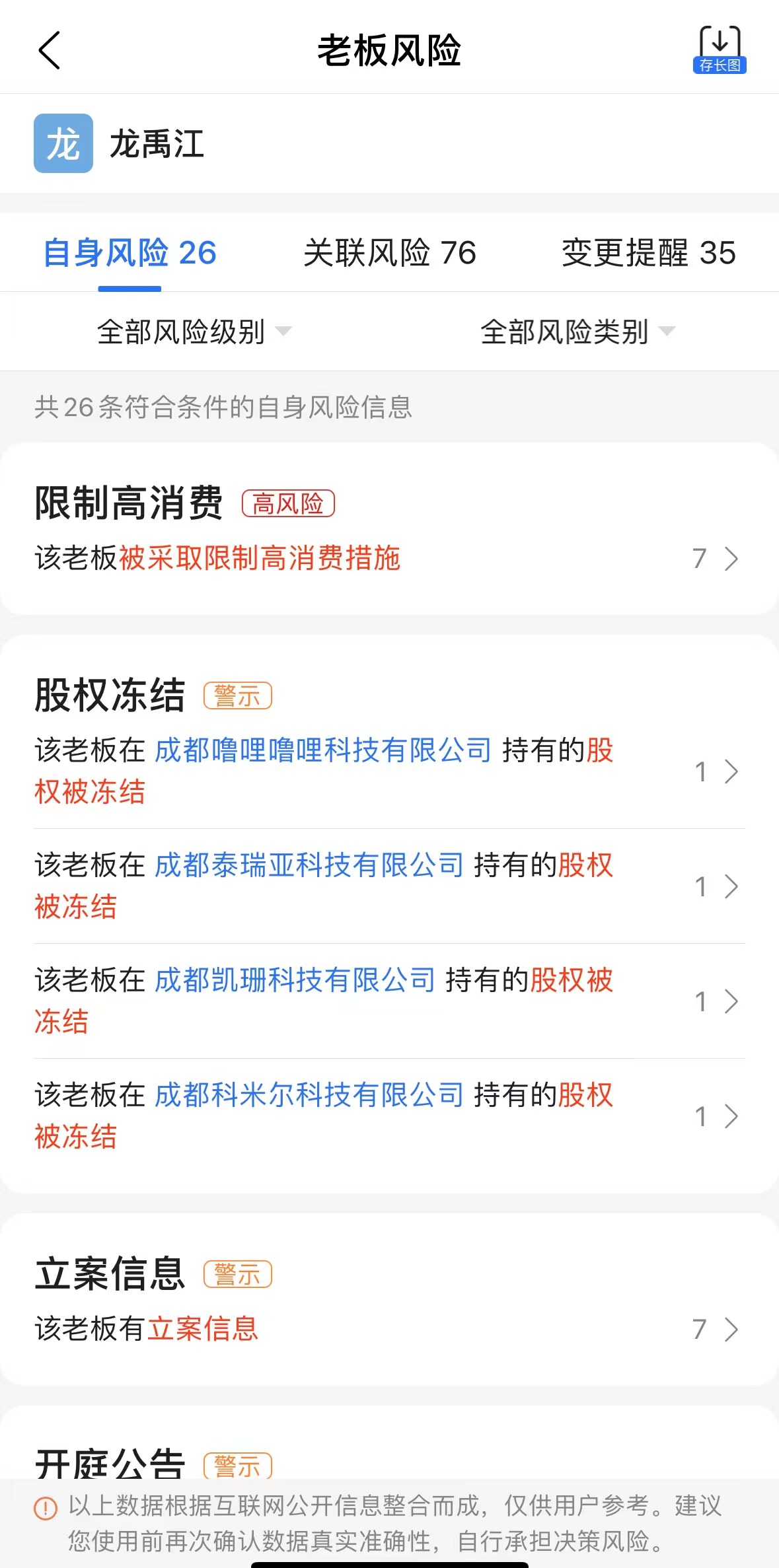 2023年3月,龙禹江持有的成都噜哩噜哩科技有限公司股权被法院冻结,其持有该公司90%的股权。