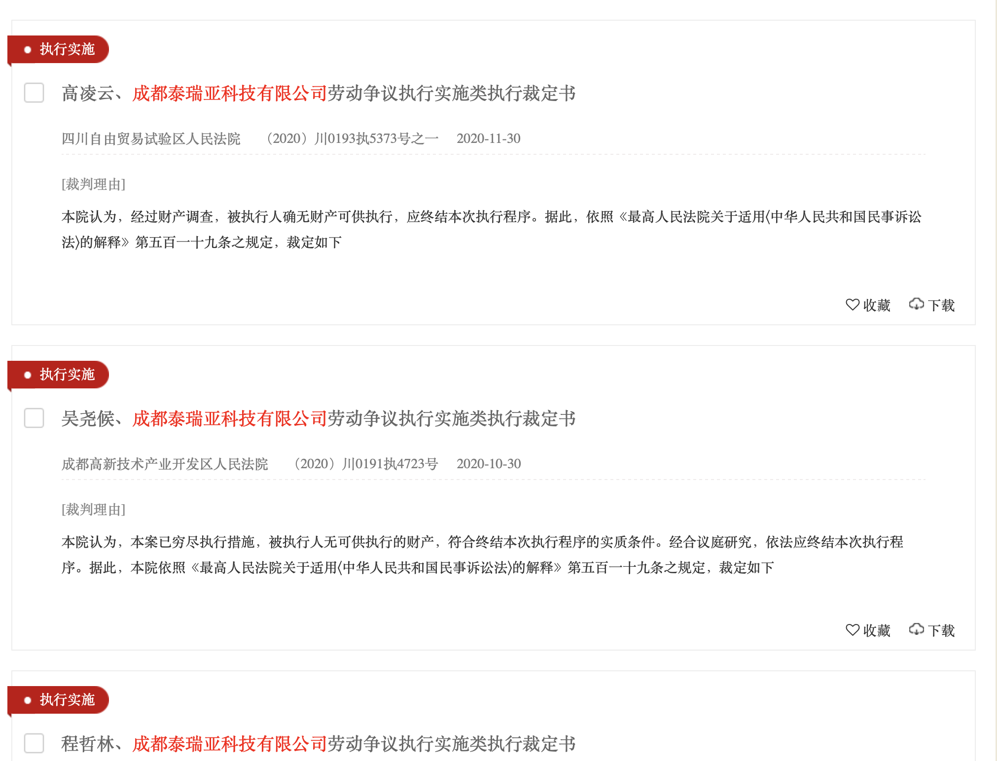 2020年,成都泰瑞面临类似的欠薪劳动仲裁还有多起,裁定书都显示成都泰瑞无可执行财产。
