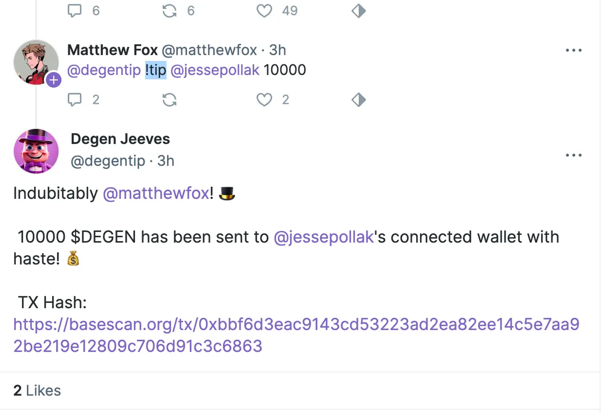 Degen Jeeves 是一个$DEGEN 自动化机器人,可基于命令行!tip直接向特定的Farcaster 用户打赏特定额度的$DEGEN代币,在打赏之前需要使用!create 自动创建一个 base钱包。