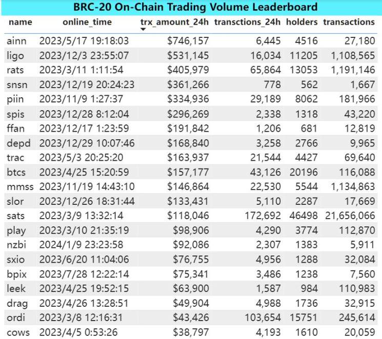 ligo(BRC-20 Token):比特币 Layer2 协议的 BRC-20 代币,LIGO 在 BTC L2 上实现 EVM,增强了与以太坊及其 DeFi 生态系统的兼容性,提供了更大的可伸缩性和流动性。根据 Mint 成本(GAS70-120)计算的市值在 700 万到 1000 万之间。2023 年 12 月 3 日部署,目前已有超过 11k holders。受 Binance Web3 钱包支持 BRC 铭文影响,BRC20 板块普遍逆势小幅上涨。