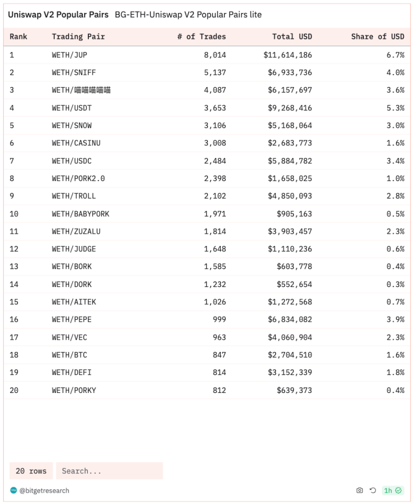 JUP(Token):Solana 上 Dex Jupiter 在以太坊上的同名项目,受其空投及发币热潮影响,市值一度达到 2000 万美金,随着炒作获利盘退出,跌幅一度超 60%,过去 10 小时交易量大幅减少。