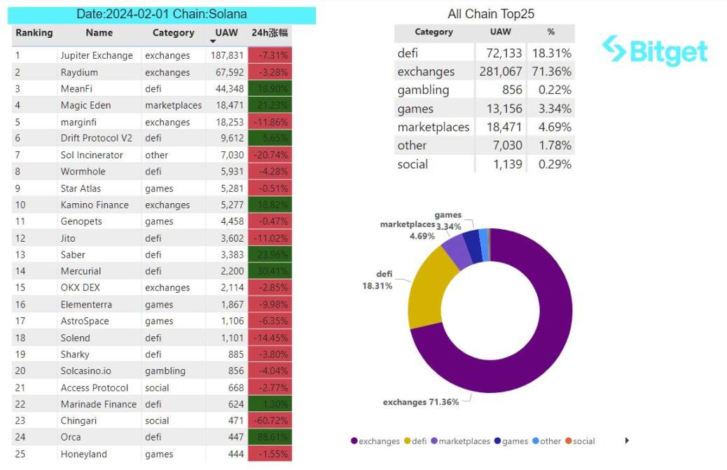Jupiter(Dapp):Solana 上核心的 DEX 聚合器,占据了超过 75% 的交易量。昨日 jupiter 开启项目的空投和上线活动,共计空投 10 亿枚代币给社区,按照 0.6 美金的价格计算,空投的额度有 6 亿美金的市值,上线几乎所有头部交易所,目前已有超 50% 的空投代币被领取。