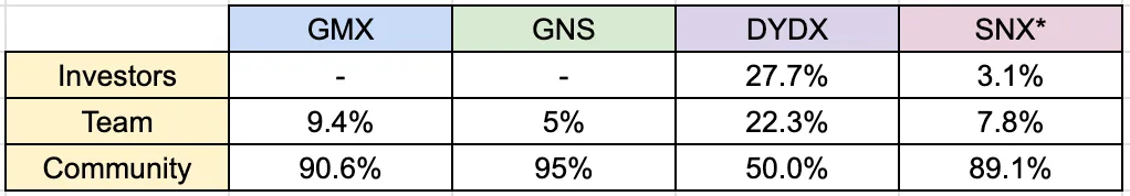 dYdX和Synthetix都为投资者保留了大量的供应,分别为27.7%和50%(在供应变化之前)。然而,dYdX有大约2年的长锁定期,而Synthetix在TGE后有3个月的锁定期,之后每季度解锁