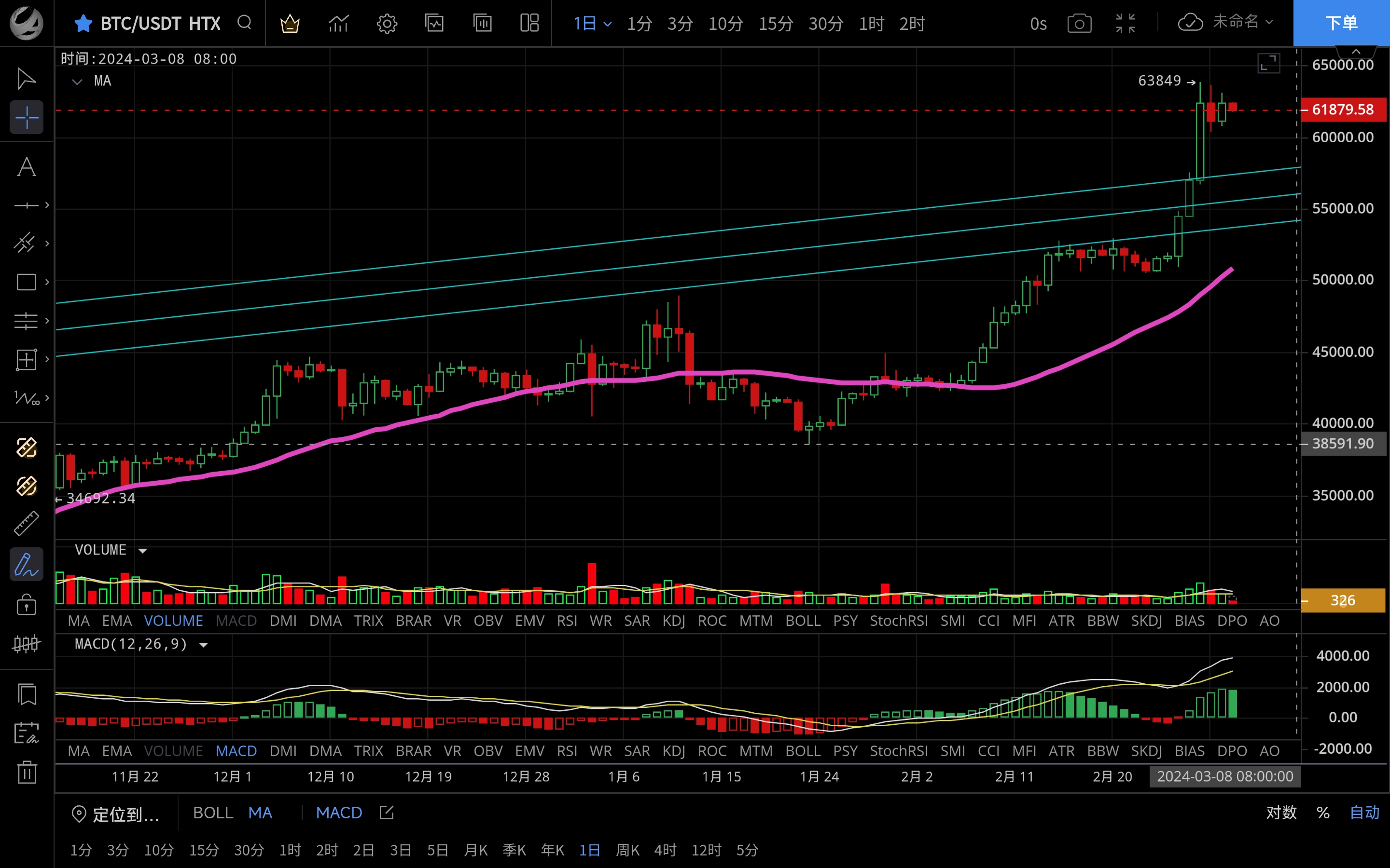 大饼昨日白盘波动不大,晚间回踩至61160一线支撑反弹,最高触及63100一线受阻回落,恭喜跟上低多思路的朋友,目前币价在62240附近运行,四小时级别行情冲回ma7上方运行,但反弹力度不大,短期高点逐步降低,macd空头运行双线死叉向下,预计还有下行需求,但空间不会太大,目前走势呈高位震荡上下都不延续,日线级别继续维持昨日思路,虽出现抛压但问题不大,等待市场消化后市会突破历史高点,只是时间问题,个人思路依旧维持低多为主高空为辅操作,上方压制62800-63800,下方支撑61000-60500
