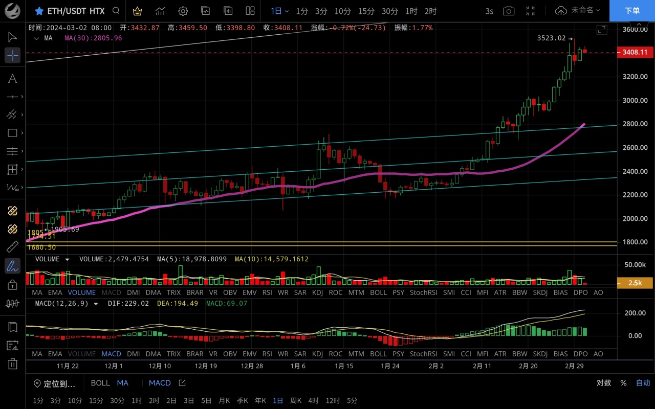以太坊昨日整体呈震荡上行走势,最高触及3450一线受阻回落,下方支撑较强行情在3380一线止跌再次反弹,恭喜跟上低多思路的朋友,目前币价在3424附近运行,四小时级别碎步式上涨幅度不大,上方阻力较强短期受阻,macd空头运行双线死叉向下量能不大,走势来看有回落需求,预计空间不会太大,短期多单切勿着急入场关注回踩力度,日线级别从走势来看面临回踩,下方先关注3350能否撑住,撑不住则会试探ma7均线,短期上涨受阻预计会盘整一段时间,短线的话高空低多操作,方向是看涨的,长线继续低多持有,上方压制3460-3500,下方支撑3350-3300
