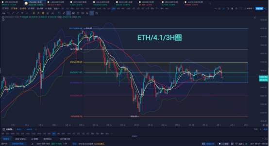 ETH/4H/3H技术走势分析:4小时与3小时价格走势基本一致维持在3700-3450