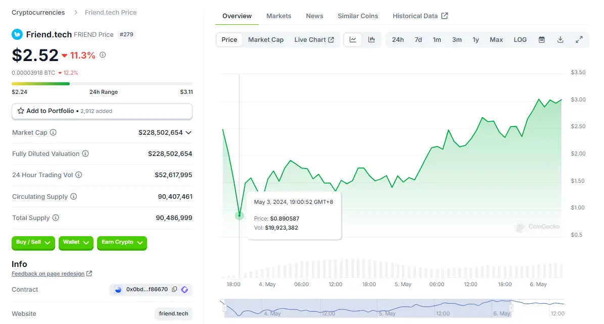 在动态的加密市场中,Friend.tech正在以其创新的社区驱动模式迅速吸引眼球。根据CoinGecko的数据,$FRIEND代币短期内价格从1.54美元飙升至2.65美元,24小时内涨幅高达72.6%,市值达到约2.27亿美元,排名上升至第271位。此外,$FRIEND的日交易额达到5622万美元。