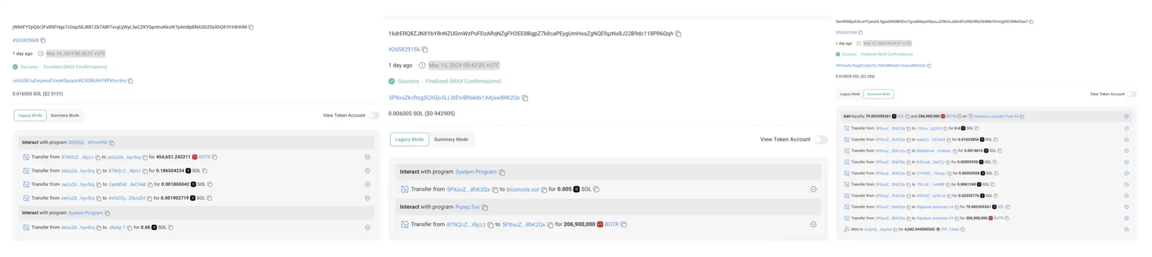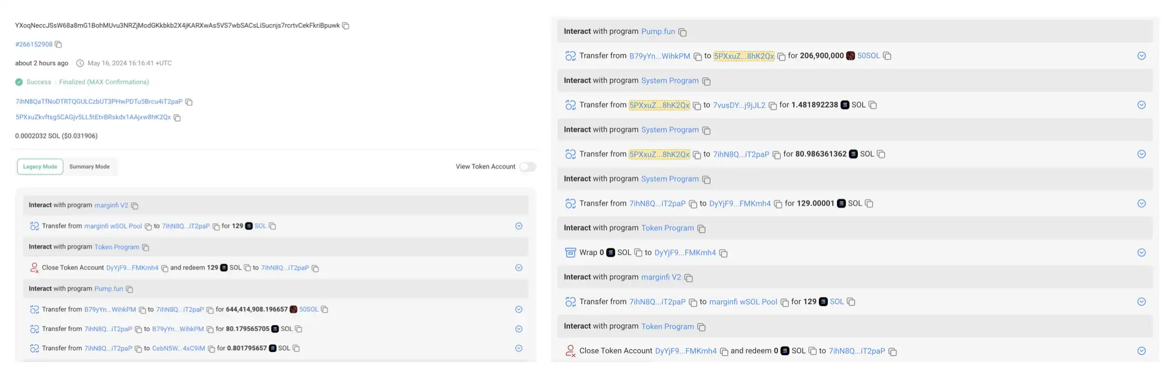 而在此次攻击事件中,其流程变为交易者开启 129 SOL 的闪电贷来购买 meme 代币,以此让 5PXxuZ 从联合曲线中提取流动性,随后偿还闪电贷,而 Raydium 上却无法创建流动性池。