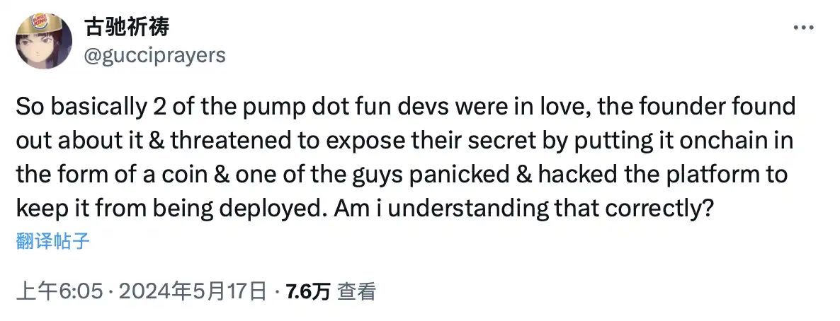 还有 X 用户 @gucciprayers 表示,此次事件是因为 2 个 pump.fun 的开发者相爱了,在被创始人发现后「威胁要通过发 meme 的形式揭露他们的秘密」,导致其中一个人惊慌失措并入侵了平台以阻止该 meme 被部署。当然,这一说法的真实性尚未经过证实。