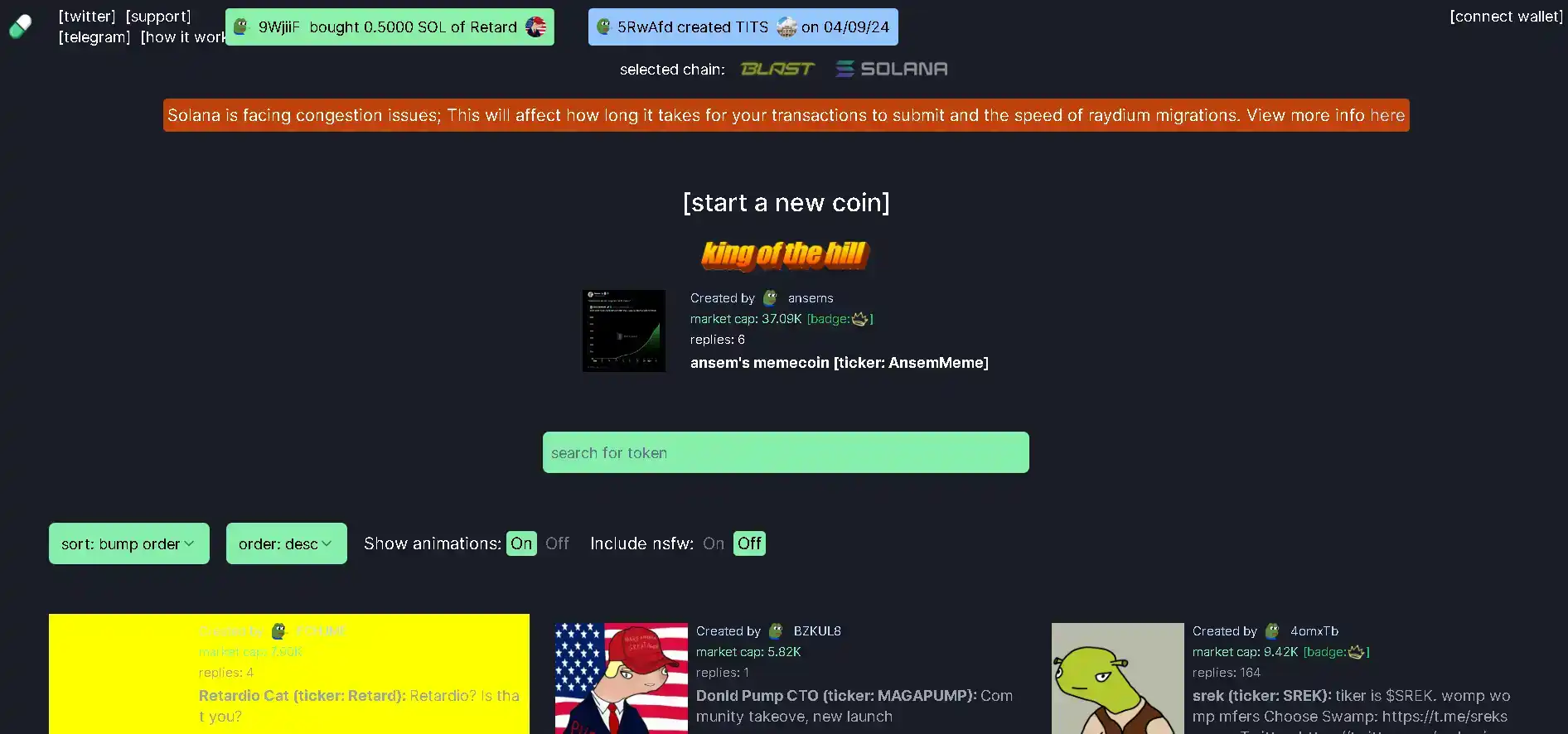 作为一个专门炒 Meme 的平台,Pump.fun 最初是为 Solana 推出的。在该平台上,人们可以以低于 2 美元的成本价部署代币。目前,Pump.fun 也许已经是 Solana 生态上流量最大的 Memecoin 平台,并增加了对以太坊 L2 Blast 的支持。