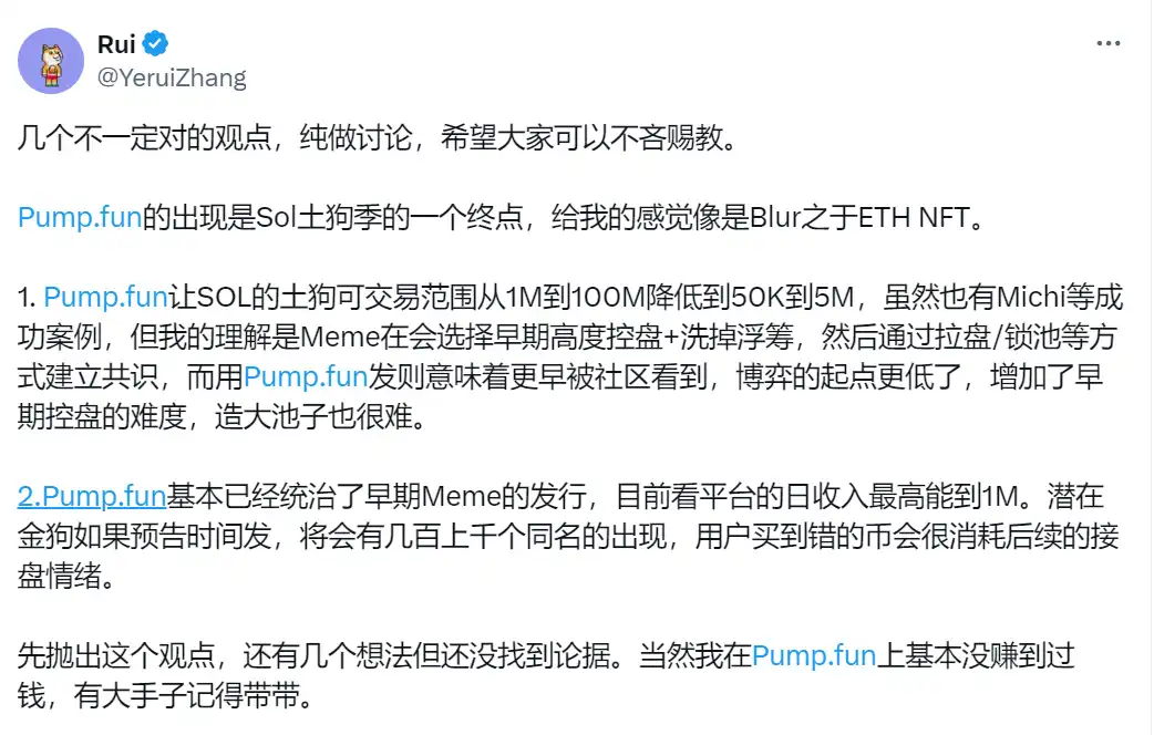 pump.fun 被盗后,社区就这款 meme 发行产品的讨论颇多,许多用户表示,自己「很少在平台上赚到钱」。X 用户 @YeruiZhang 表示 pump.fun 的出现是「Sol 土狗季的一个终点,给人的感觉像是 Blur 之于 ETH NFT」,这一观点尤其引起社区的热烈讨论。