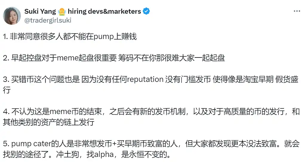 @tradergirlsuki 认为,早期控盘对于 meme 的起盘很重要,筹码不在手中则很难起盘。而 pump.fun 让散户难以赚到钱,那么市场自然会去寻找找新的途径,「冲土狗,找 alpha 是永恒不变的命题」。