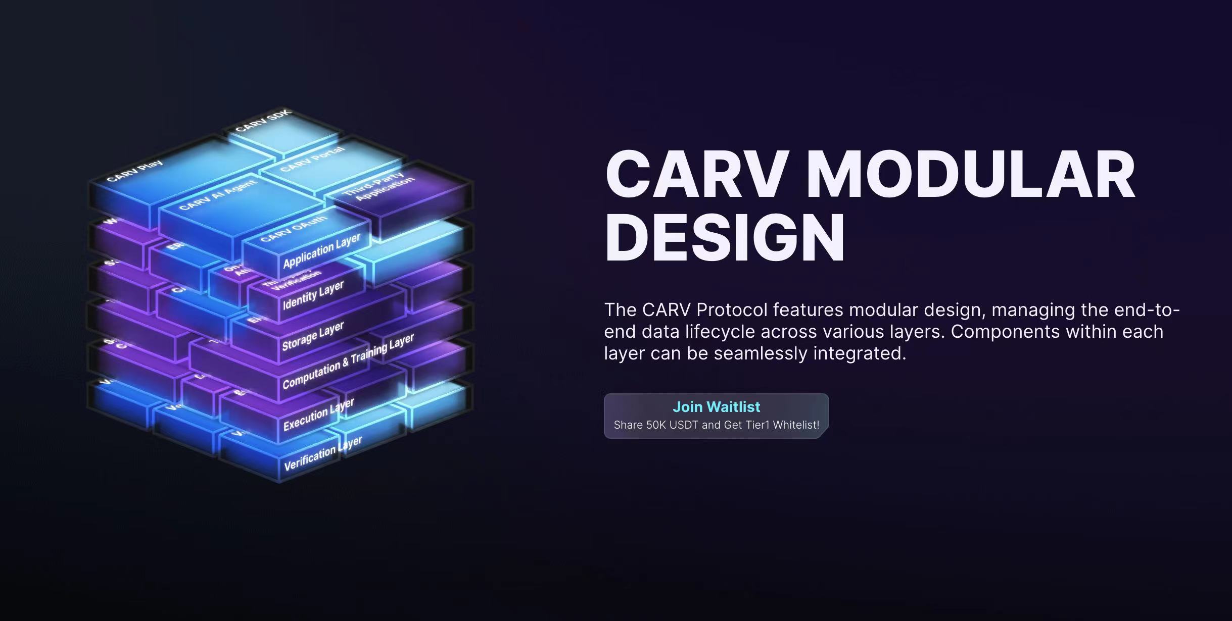 CARV Protocol 是一个模块化数据层,用于促进游戏和 AI 领域的数据交换和价值分配。通过端对端数据流流程,采用模块化设计,通过身份层、存储层、计算与训练层、执行层、验证层等五个模块,进行数据验证、身份认证、存储、处理、模型训练与价值分配等流程。通过 CARV 协议,数据的所有权、控制权与验证权再次回到用户手中,并可以将数据代币化以获得收益。 CARV Protocol 确保以上权利掌握在个人手中,改变了长久的数据使用与共享方式。
