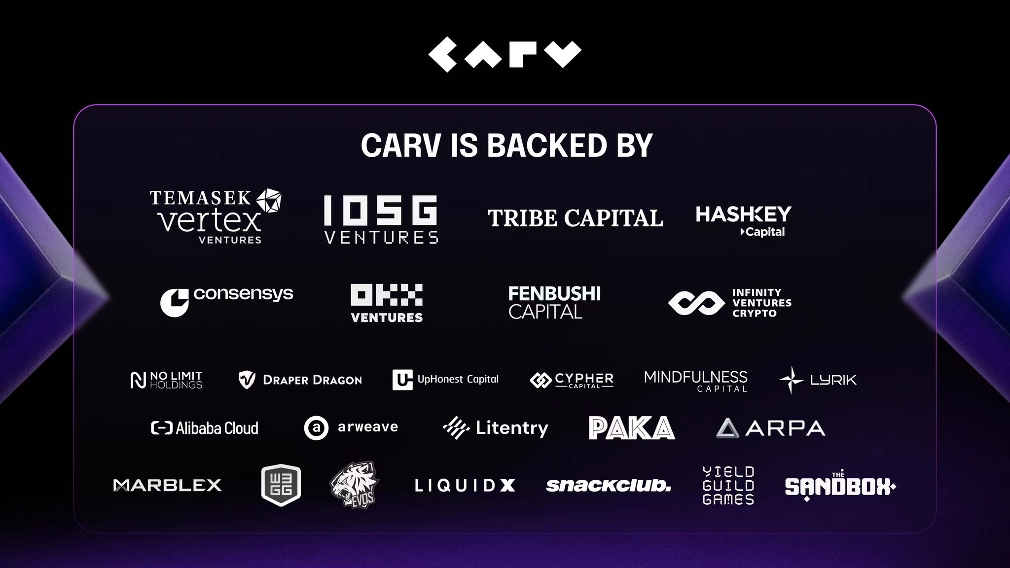 • 2024 年 4 月,CARV 完成了 1000 万美元 A 轮融资,Tribe Capital、IOSG 领投。Consensys、OKX Ventures、Fenbushi Capital、No Limit Holdings、Draper Dragon、Arweave、LiquidX、MARBLEX 等参投。本轮融资将用于构建跨链模组化数据层并推动数据经济创新。