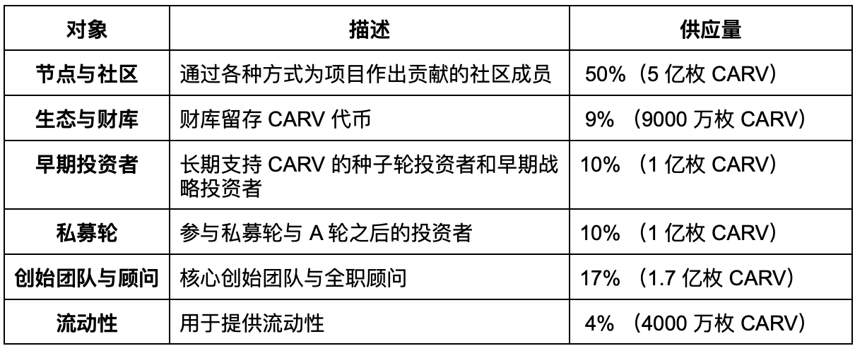 CARV 总供应量为 10 亿枚,从 TGE 开始后四年内完成解锁,初始分配如下: