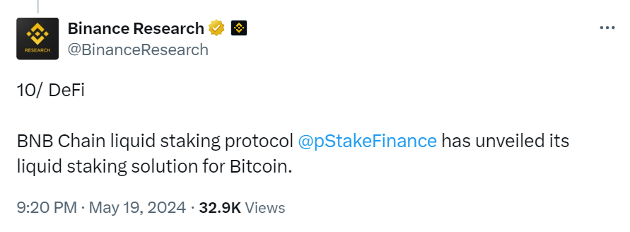 对于pSTAKE最新的业务发展方向,币安也有所反馈。Binance Research在5月19日的每周市场亮点总结中,提到了这一次变化。