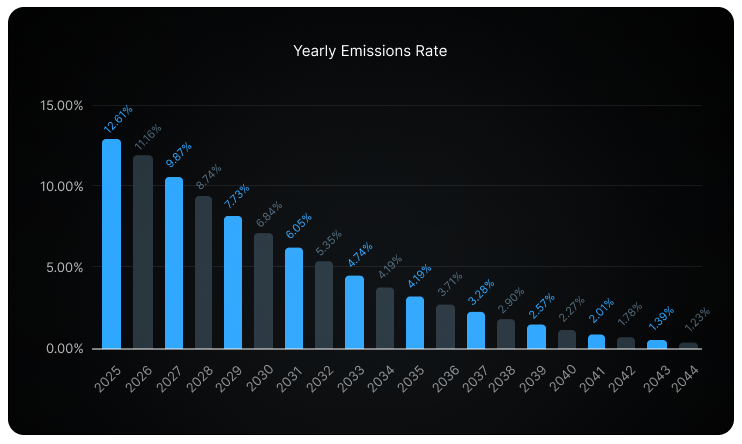$IO 的最大总供应量为 800 million,其中 500 million 枚在代币 TGE 时就进行了各方对应的分配,剩余 300 million 枚代币会在 20 年内逐步递减释放(释放量每月递减 1.02%,约为每年递减 12%)。当前 IO 流通量为 95 million,其中由 TGE 时为生态研发和社区建设解锁的 75 million 和币安 Launchpool 20 million 的挖矿奖励组成。