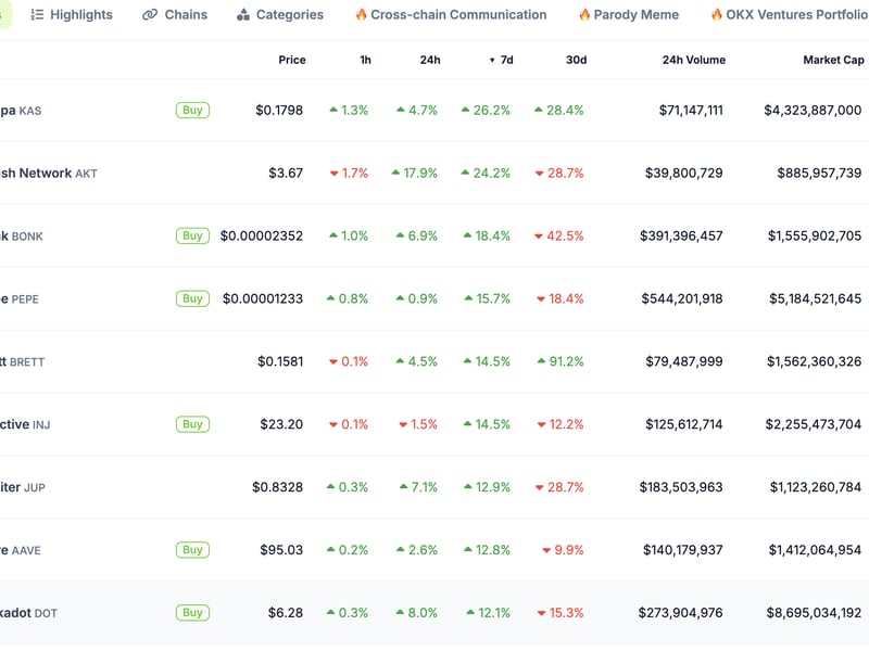 然而,这种下跌掩盖了Kaspa区块链的KAS代币上涨了26%。该代币在市值排名中位列第27位,已突破18美分,接近本月初创下的0.196美元的纪录高点,据数据来源CoinGecko称,这使KAS成为市值前100数字资产中表现最佳的代币。
