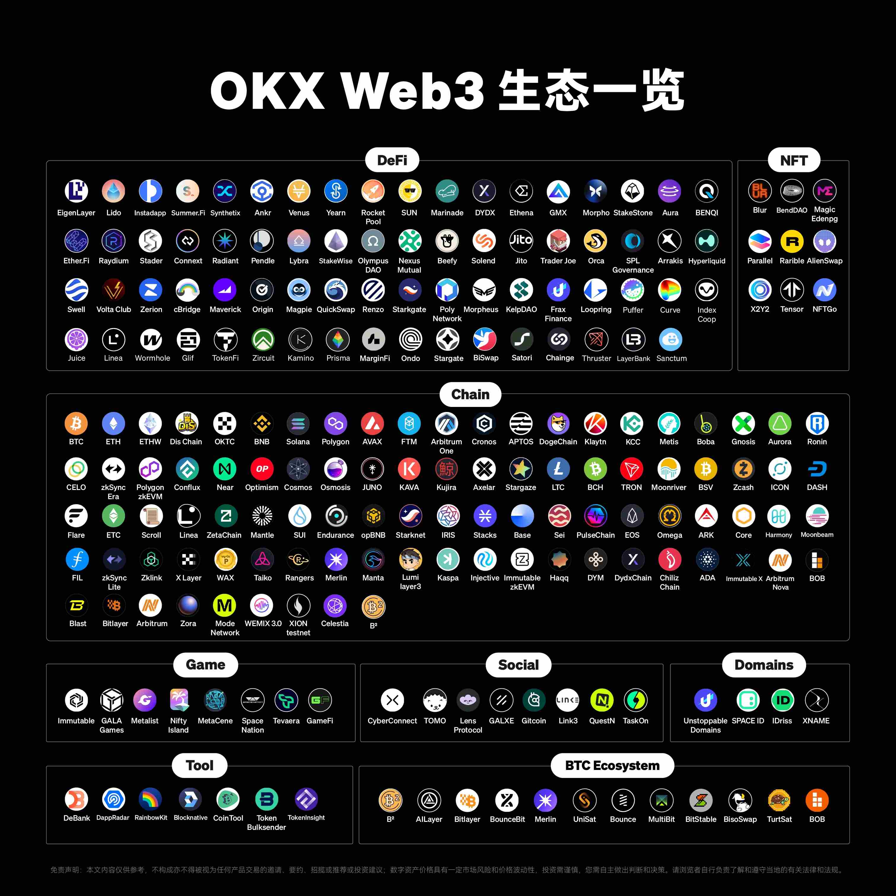 而在打造更丰富生态进一步实现「一个入口玩转 Web3 全生态」愿景方面,OKX Web3 生态旨在以钱包为起点、以交易为支点覆盖从 DeFi、NFT 到游戏、RWA 等各层面应用场景,为用户带来丝滑、丰富、高效、低成本的交互体验。目前 OKX Web3 钱包支持 95+ 条公链与 1000+ dApp,用户既可以通过钱包 DeFi 模块轻松参与 200+ DeFi 协议的各类投资活动赚取收益,也可以在钱包 NFT 市场模块玩转 20+ 网络的 NFT 交易,甚至可以通过 Dapp 探索页面发掘早期优质项目、轻松参与交互赢取潜在收益并掌握 Web3 线下活动讯息。而且借助丝滑的跨链 Swap 功能,用户免去繁琐操作的顾虑