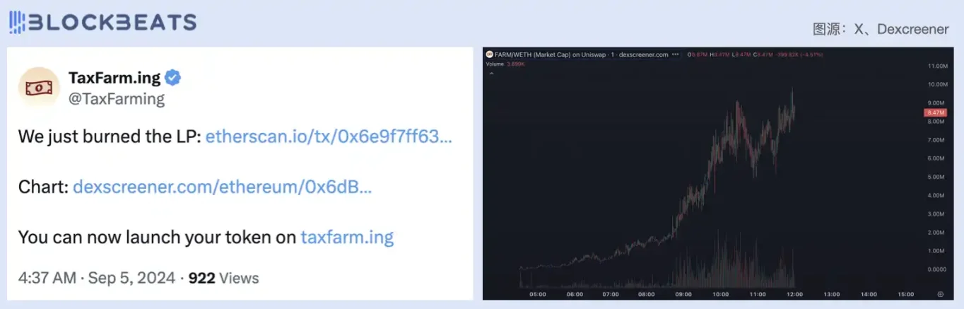 今日早晨 4 点半,一个以太坊上的 meme 币平台 TaxFarm.ing 在推特上发布了第一条推文,放出了代币「FARM」合约和协议平台入口。之后,FARM 一路上涨,上线 6 小时市值突破 800 万美元,最高触及 960 万美元。如果按开盘 10 分钟后买入的价格计算,最高涨幅达 150 倍,实现时间为 5.5 小时。截至撰稿时,FARM 的价格为 0.009 美元,累计交易量 1100 万美元。