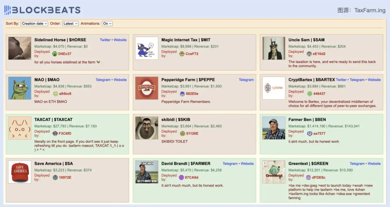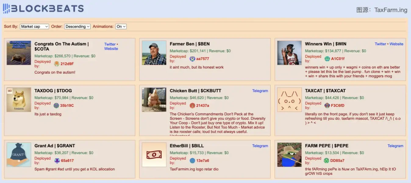 根据 TaxFarm.ing 的介绍,协议收入主要来自平台上的 meme 币交易费用的 10%。在 Blockbeats 于上午 10 时左右的截图中显示,TaxFarm.ing 上一个名为 $BEN(Farmer Ben)的代币收入已经达 14 万美元.