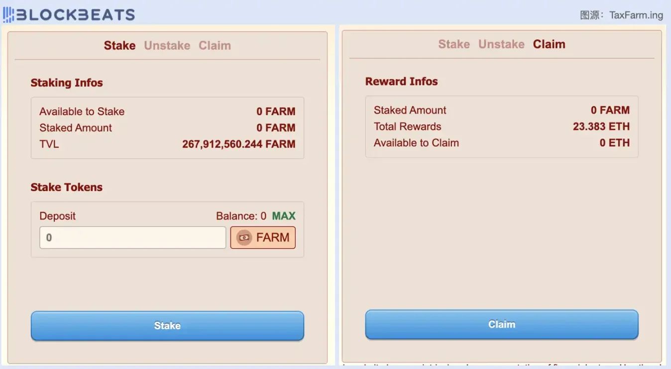 另外,TaxFarm.ing 提供了质押渠道,目前已有 2.6 亿枚 FARM 代币质押,约占总供应量的 21.6%,质押总收益为 23.3ETH,价值约为 5.6 万美元。