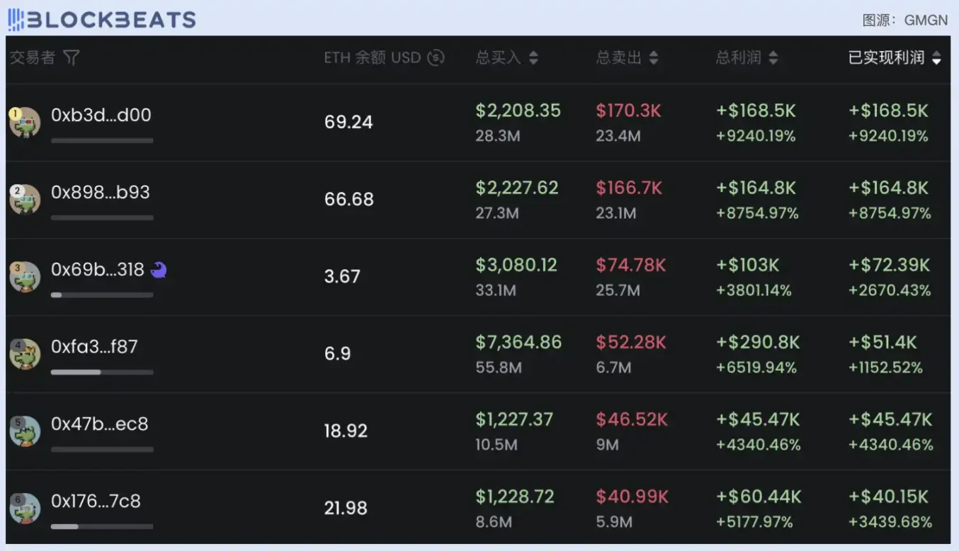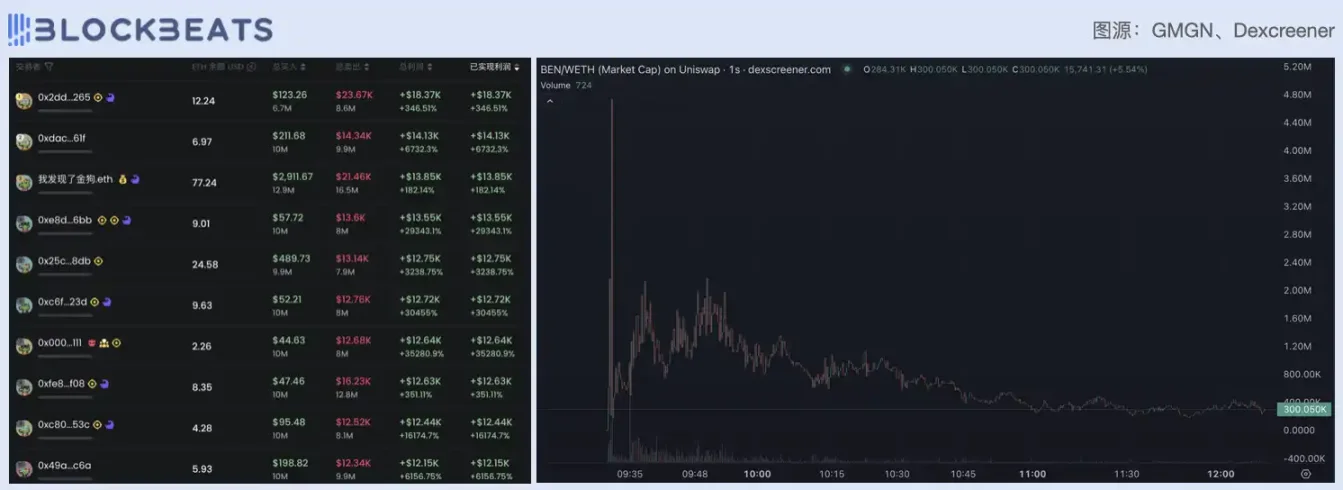 除了 FARM,手续费收入 14 万美元、被 TaxFarm.ing 官推展示的 meme 币 $BEN(Farmer Ben)也让许多人体验到了百倍币的快乐。在 gmgn 显示的前排盈利交易者中,获利最多的前十个交易者中,九个交易者的买入成本低于 500 美元,四个交易者以 50 美元左右的成本获得了 1 万美元的收益。