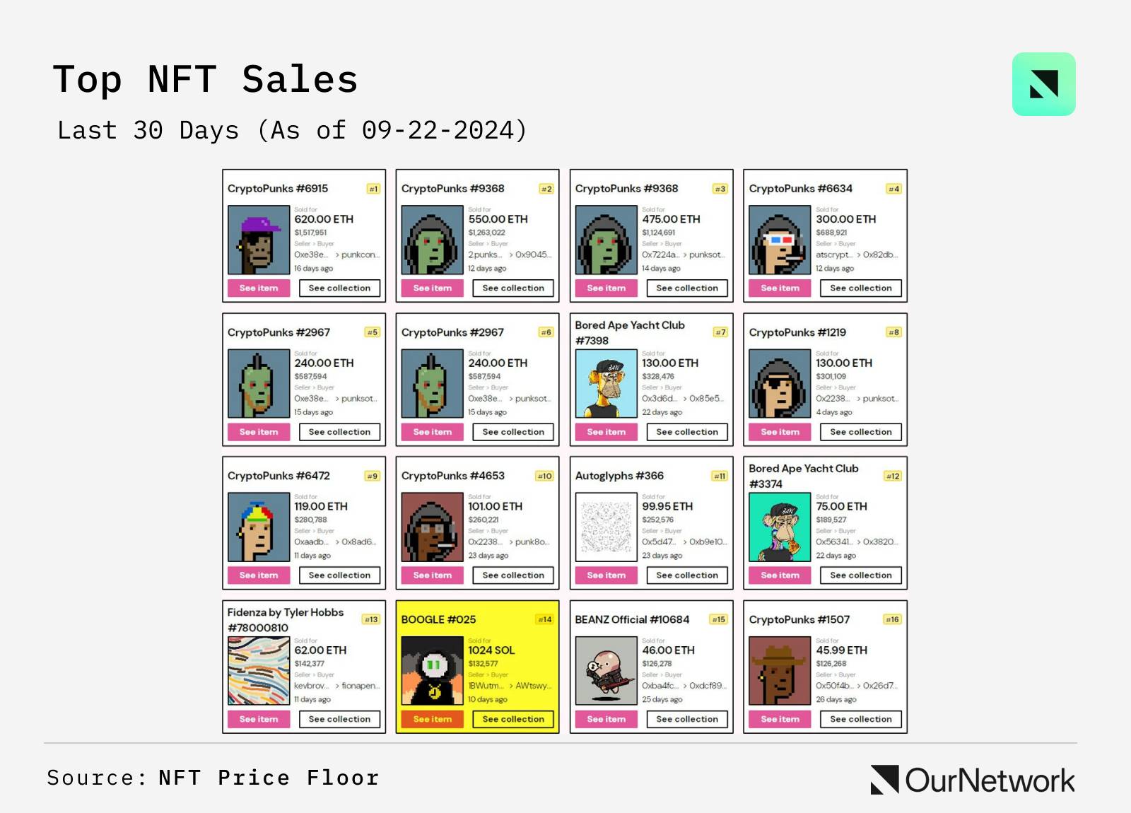 • 在过去的30天里,前四大区块链的 NFT 总交易量超过了3亿美元。其中,以太坊占42%,Solana 占23.5%,比特币占18%,Polygon 占16.5%。尽管以太坊的市场份额相比前几年有所下降——在2023年时约占70%——它仍然在高端 NFT 市场中占据主导地位。比如,在这段时间内的前30笔销售(不包括 1-of-1 NFT)中,以太坊占据了29个席位,而 Solana 仅占1个。值得一提的是,这些以太坊销售中的前三名都是 CryptoPunks,其中一个具有猿特征,两个具有僵尸特征,每个售价都超过100万美元。
