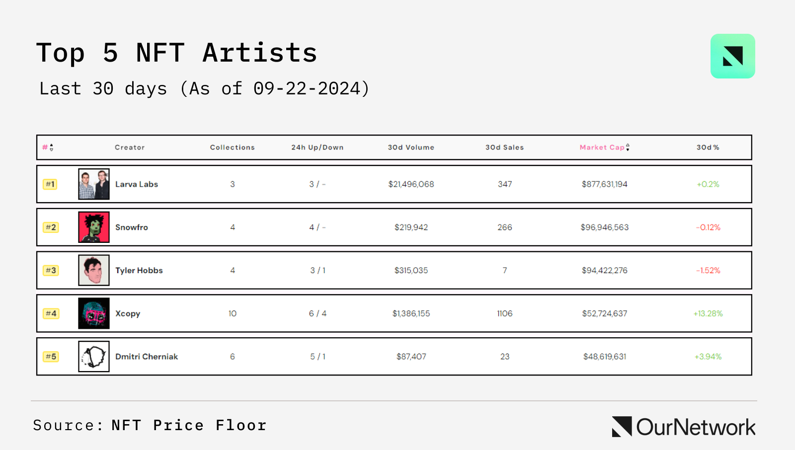 • 在上个月的前30笔销售中——不包括 1-of-1 类型——有23个出自 Larva Labs,Dmitri Cherniak 和 Tyler Hobbs 各占1个。这两位艺术家在 1-of-1 收藏领域中经常是顶级卖家。根据 NFT Price Floor 的艺术家排名,该排名按艺术家收藏的市值进行排序,XCOPY 这位 NFT 艺术家以市值增长13%而脱颖而出,跻身前四名。