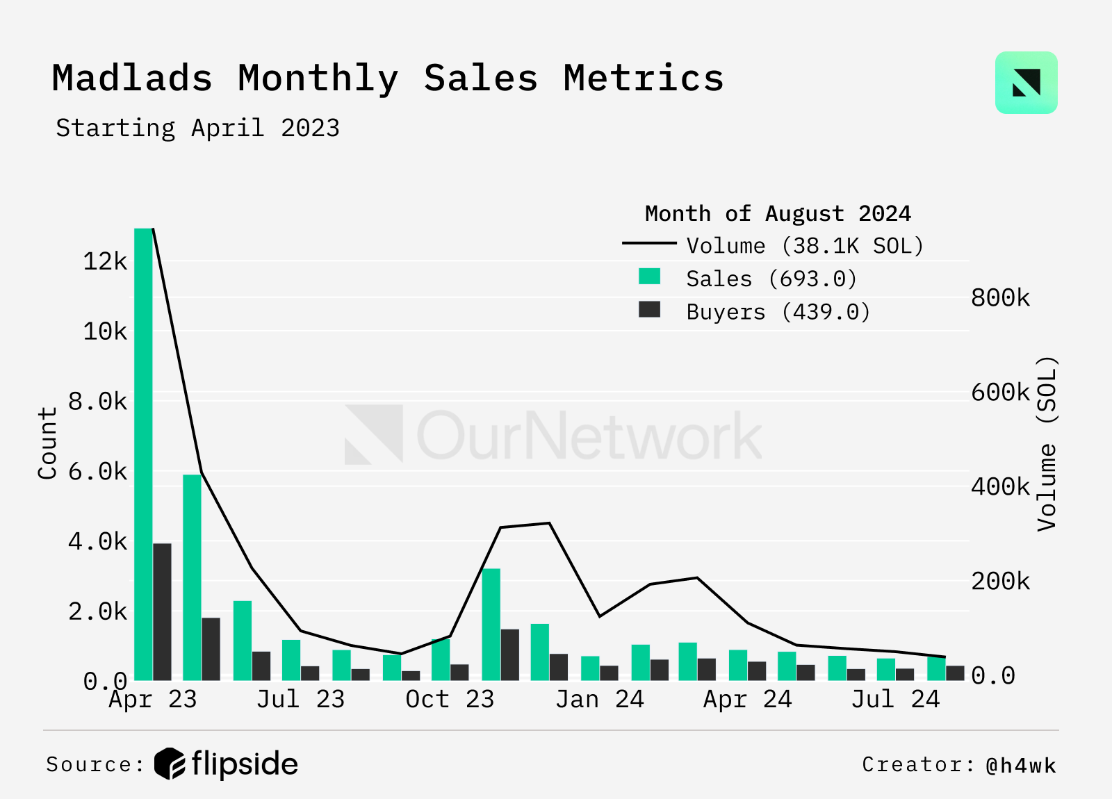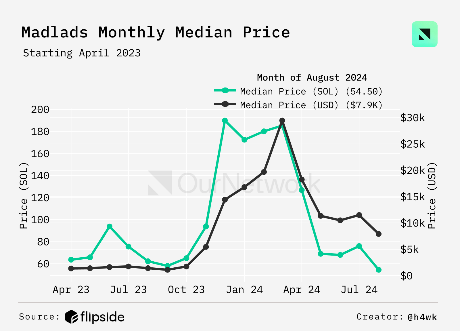 • 在 Mad Lads 于 2023 年 4 月发布后的第一个月中,有 3,900 名买家推动了 946,000 SOL 的交易量,按当前价格计算约为 1.37 亿美元。从 2023 年中期开始,Mad Lads 的价格从接近 100 SOL 的高点下滑,但在 2024 年 3 月回升至中位价 185 SOL(当时约为 $29,440),随后在 2024 年 8 月降至并稳定在 61 SOL(约 $8,200)。目前,Mad Lads 的价格是其第一个月价格的 6.25 倍(以美元计)。