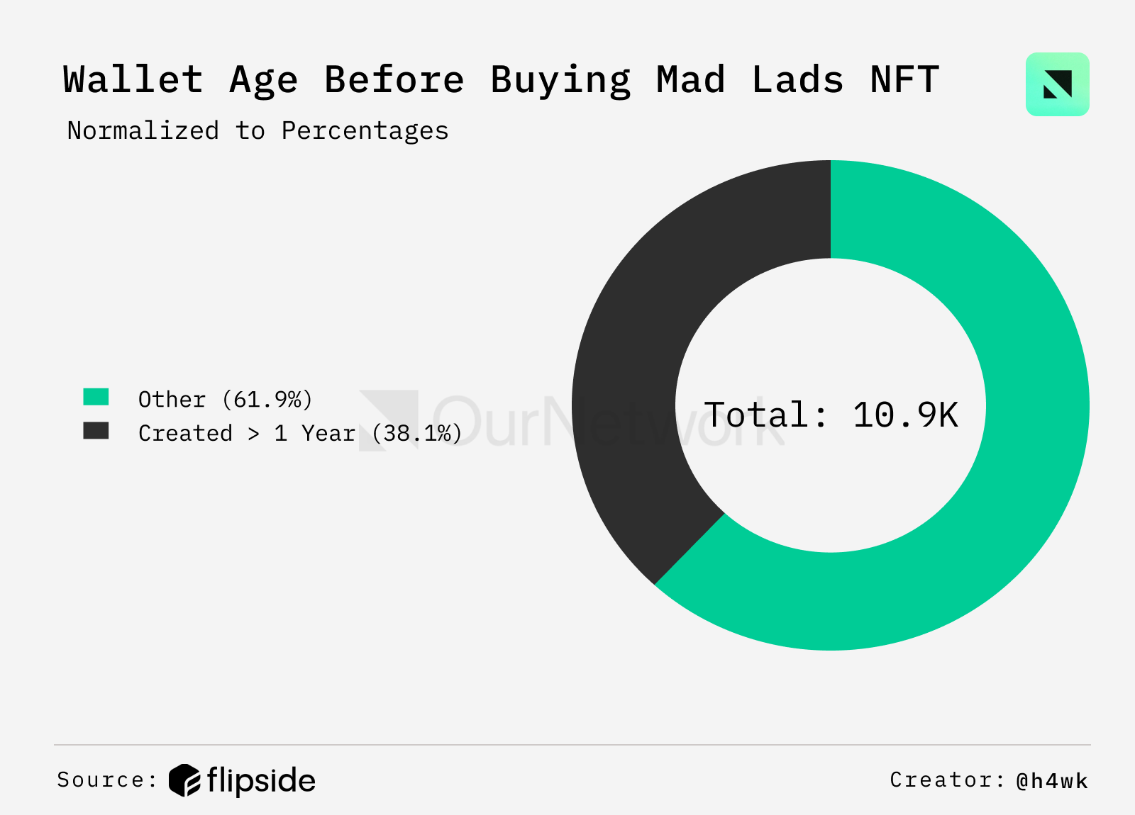 • 38% 的 Mad Lads 持有者是在购买 NFT 之前就创建的钱包进行购买的——这表明,Mad Lads 的购买中有相当大的一部分来自长期的 Solana 用户,显示出他们对网络的忠诚和深度参与。