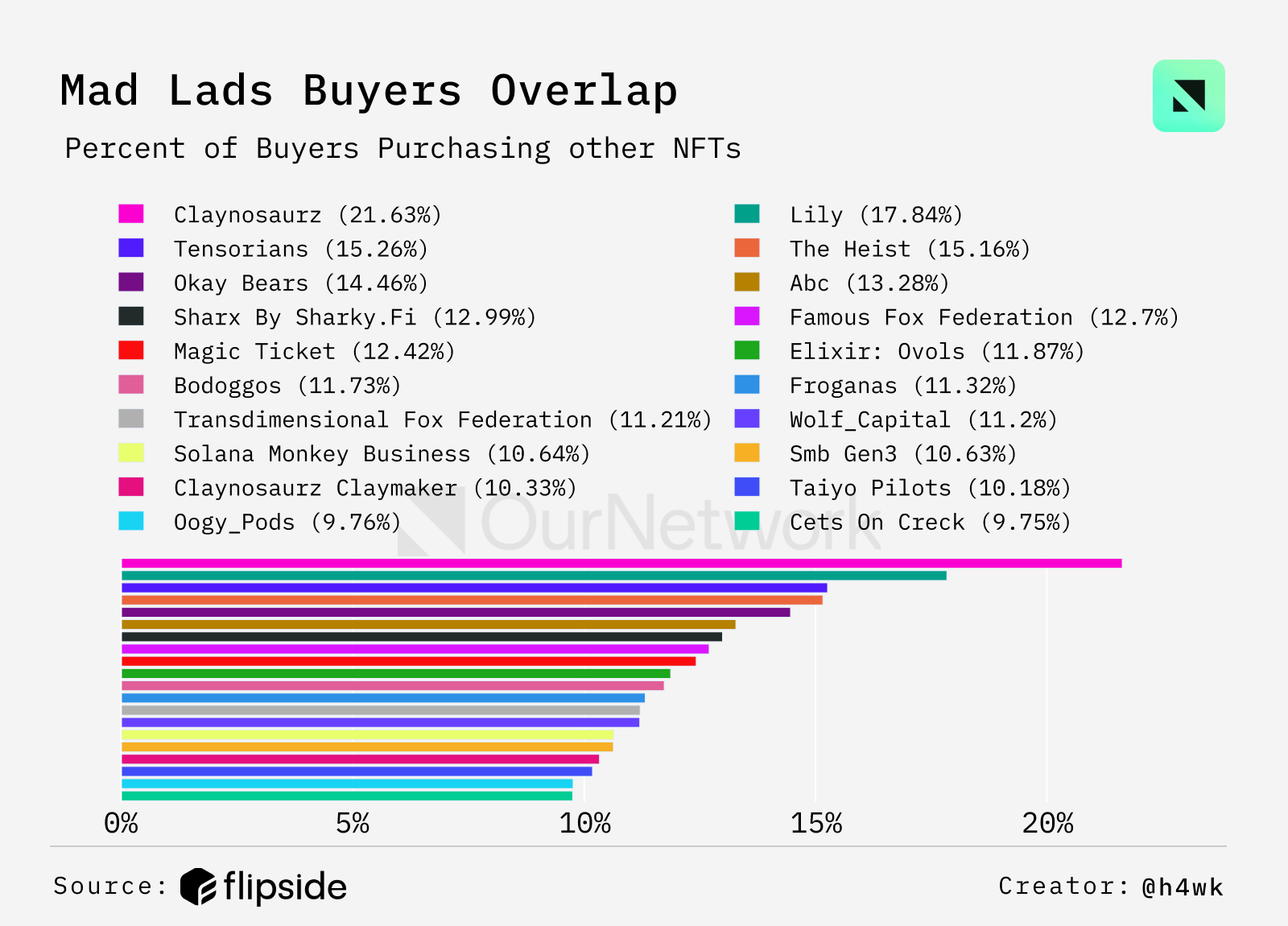 • 分析 Mad Lads 持有者的其他 NFT 收藏时,可以发现 Claynosaurz 收藏的重叠率达到 21.67%。其他 notable 的交集包括 Lily、Tensorians、The Heist 和 Okay Bears,它们的重叠率在 14% 至 18% 之间。