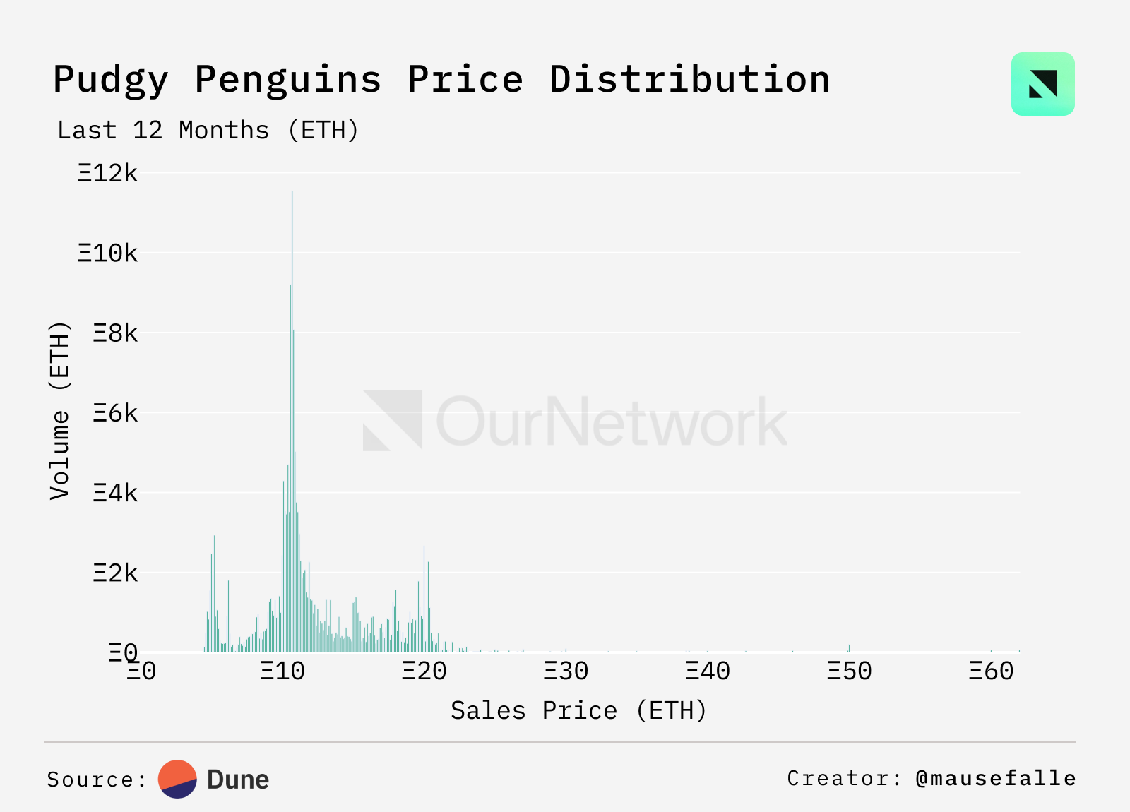 • 在过去的 12 个月中,在 10 ETH 的价格点发生了大量销售,表明市场对 Pudgys 当前底价的强烈共识。此外,5.9 ETH 和 19.9 ETH 附近也出现了小幅波动,显示出次级价格集中。