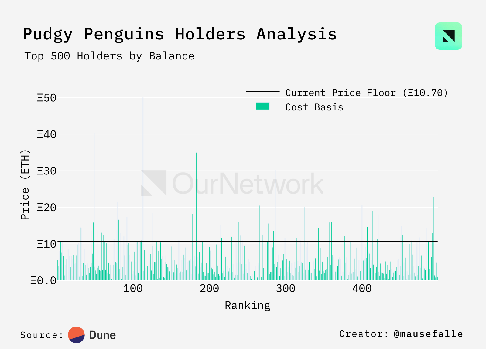 • 许多持有者的成本基础远低于当前价格(黑线),这表明大多数持有者处于盈利状态。一些持有者的成本基础则远高于其他,最高可达 40 ETH,这意味着他们购买了“稀有”的 Pudgys。