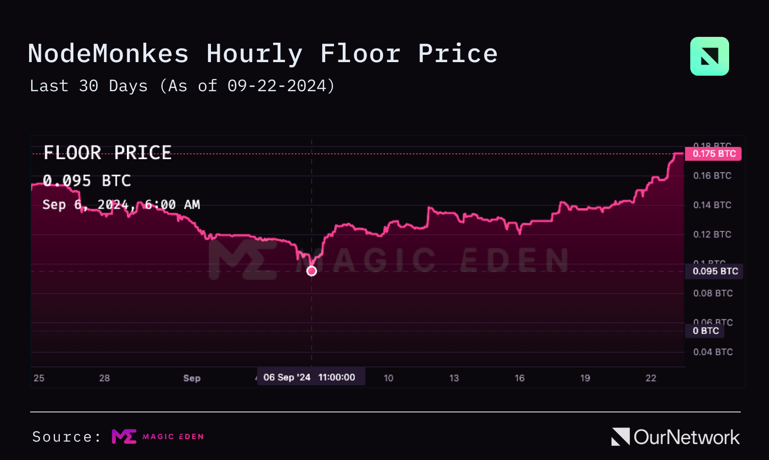 • 夏季对 Ordinals 来说是不景气的,领先的收藏经历了 70% 甚至超过 80% 的下跌。然而,有迹象表明底部可能已经形成——NodeMonkes 在 Ordinals 中引领了一轮反弹,目前从 9 月 6 日的 0.095 BTC 的局部低点上涨了 94%。它们现在的价格为 0.18 BTC,这是自 6 月 20 日以来的最高水平——有效地弥补了整个夏季的下跌。