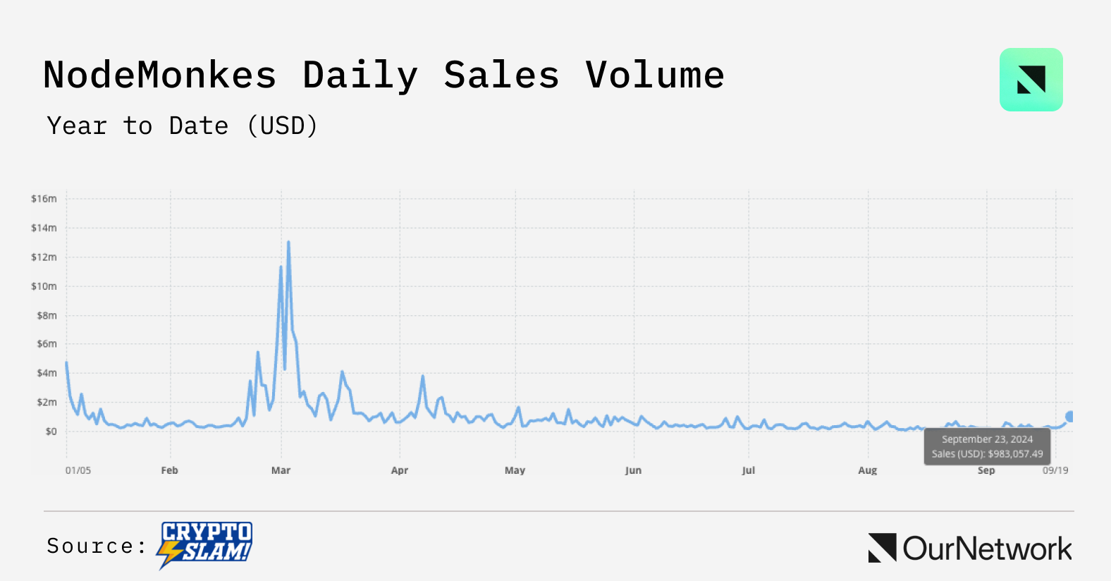 • 不仅底价处于局部高点,交易量也是如此。NodeMonkes 在 9 月 23 日的单日交易量达到近 100 万美元,具体为 983,057 美元。这是自 6 月 28 日以来的单日最高,几乎是 3 个月来的最高记录。