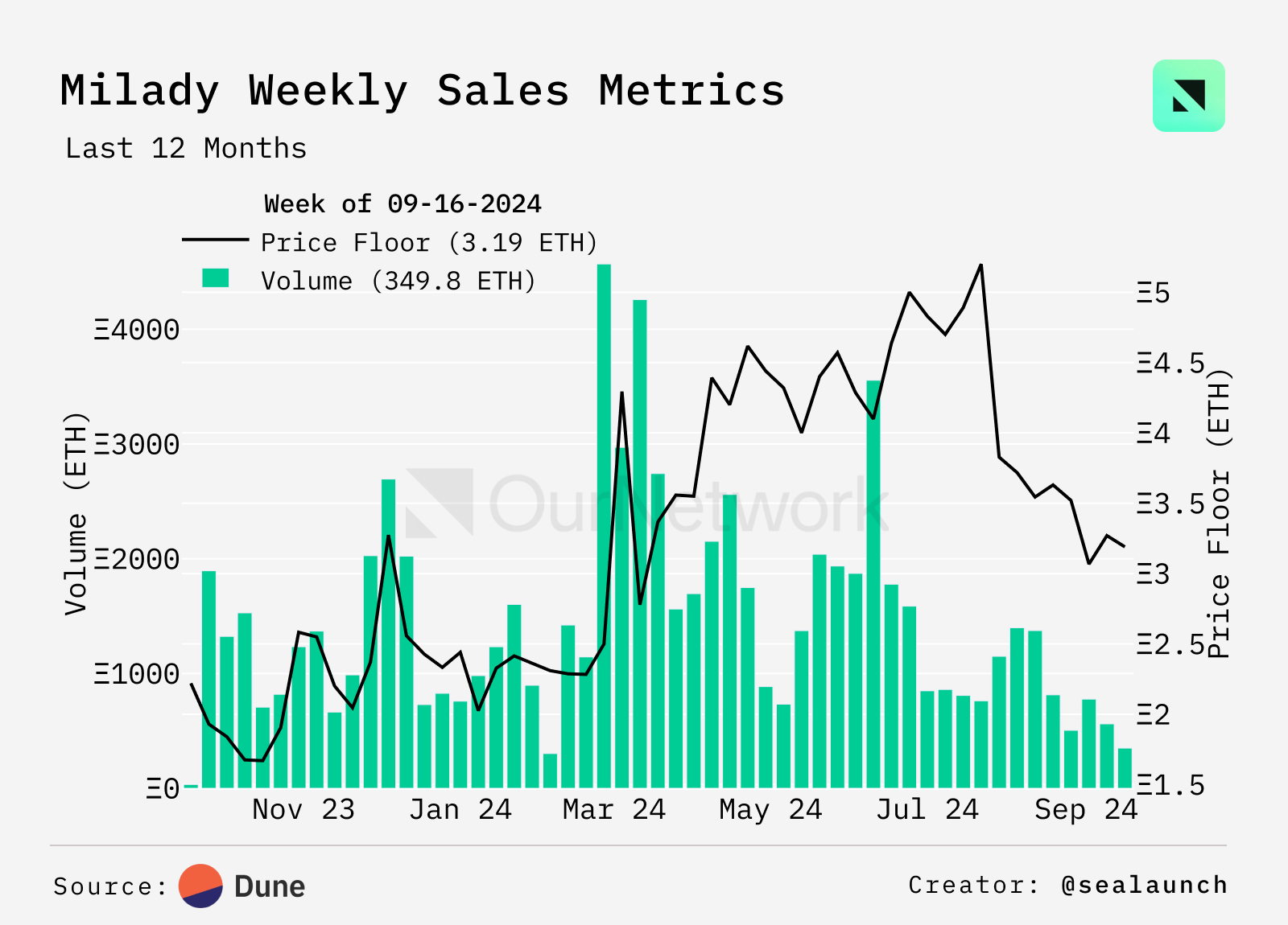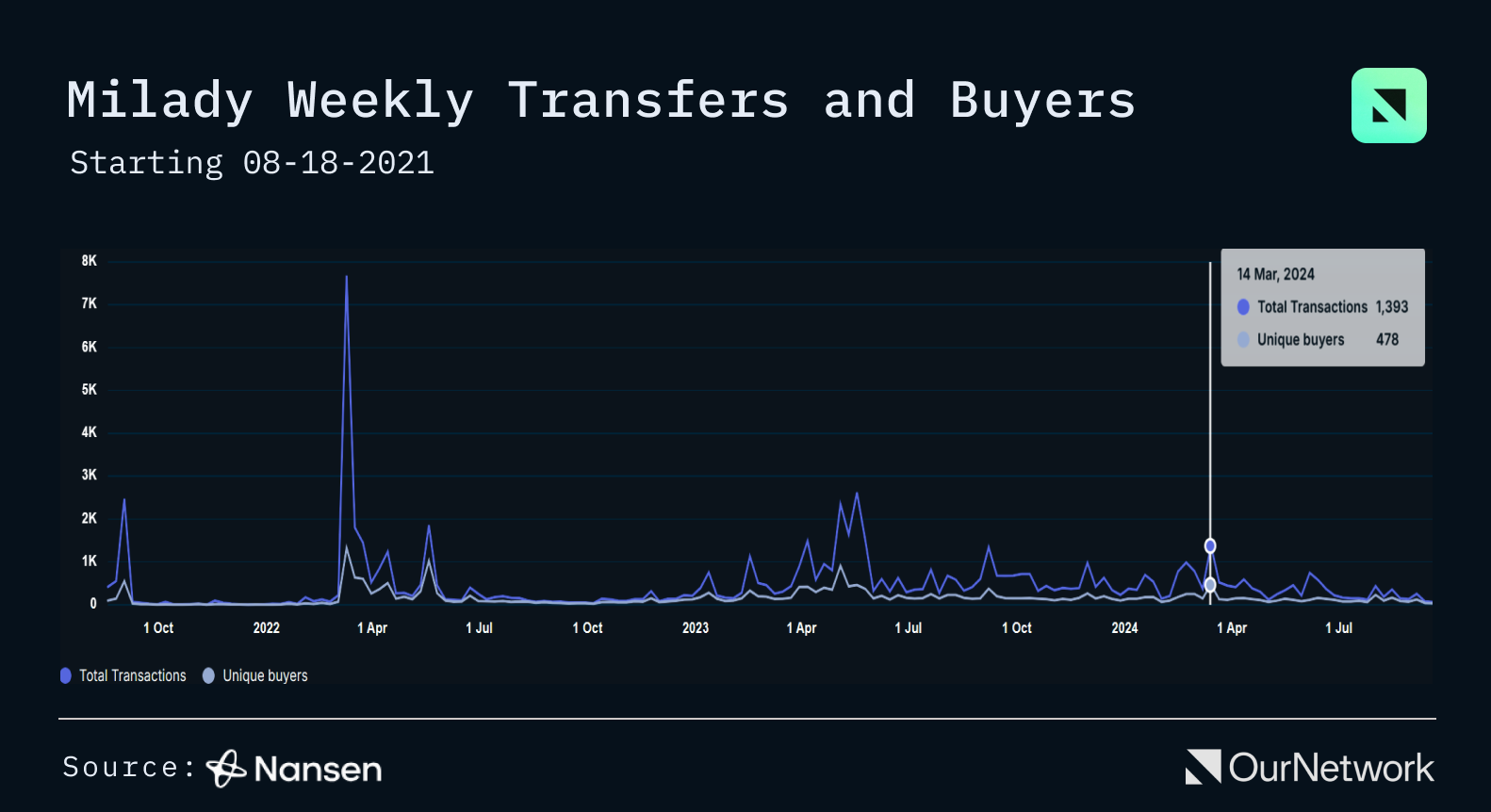 • 自年初达到峰值以来,Milady 的交易量和独立买家数量持续下降。然而,Remilia 生态系统代币 $CULT 在预售期间筹集了 2000 万美元,这可能会激活交易活动和兴趣——每个 Milady 都有资格获得价值约为 2300 USDT 的空投。