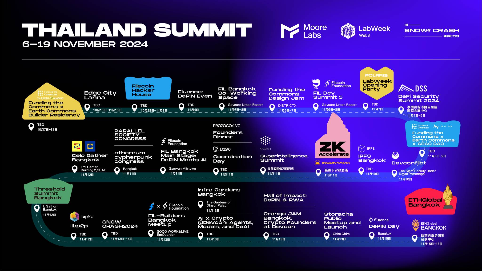 2024年11月,泰国曼谷将成为全球区块链和Web3行业的聚焦中心。由摩尔实验室(Moore Labs)主导的Thailand Summit 2024将于11月6日至19日隆重举行,这场为期两周的盛会汇集了多个重量级活动,包括ETHGlobal Bangkok、LabWeek和Snow Crash 2024。作为区块链行业2024年底最具影响力的峰会,预计将吸引超过20,000名参会者,汇聚500多个创新项目,并邀请到200多位行业顶尖嘉宾。