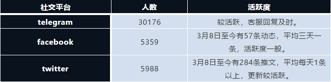 根据INLOCK官网链接,其社群人数共41523人(未去重)。综合观察来看,telegram活跃度尚可客服回复也较为及时,facebook和twitter内容主要是项目宣传以及进展状况,twitter更新活跃,facebook活跃度一般。