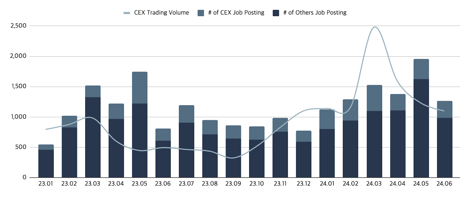 根据 Tiger Research 发布的报告显示,在美国证券交易委员会(SEC)于 2024 年 1 月批准比特币现货 ETF 后,全球 Web3 市场的招聘职位开始显著增加。随着市场复苏预期的上升,招聘活动变得相对活跃。