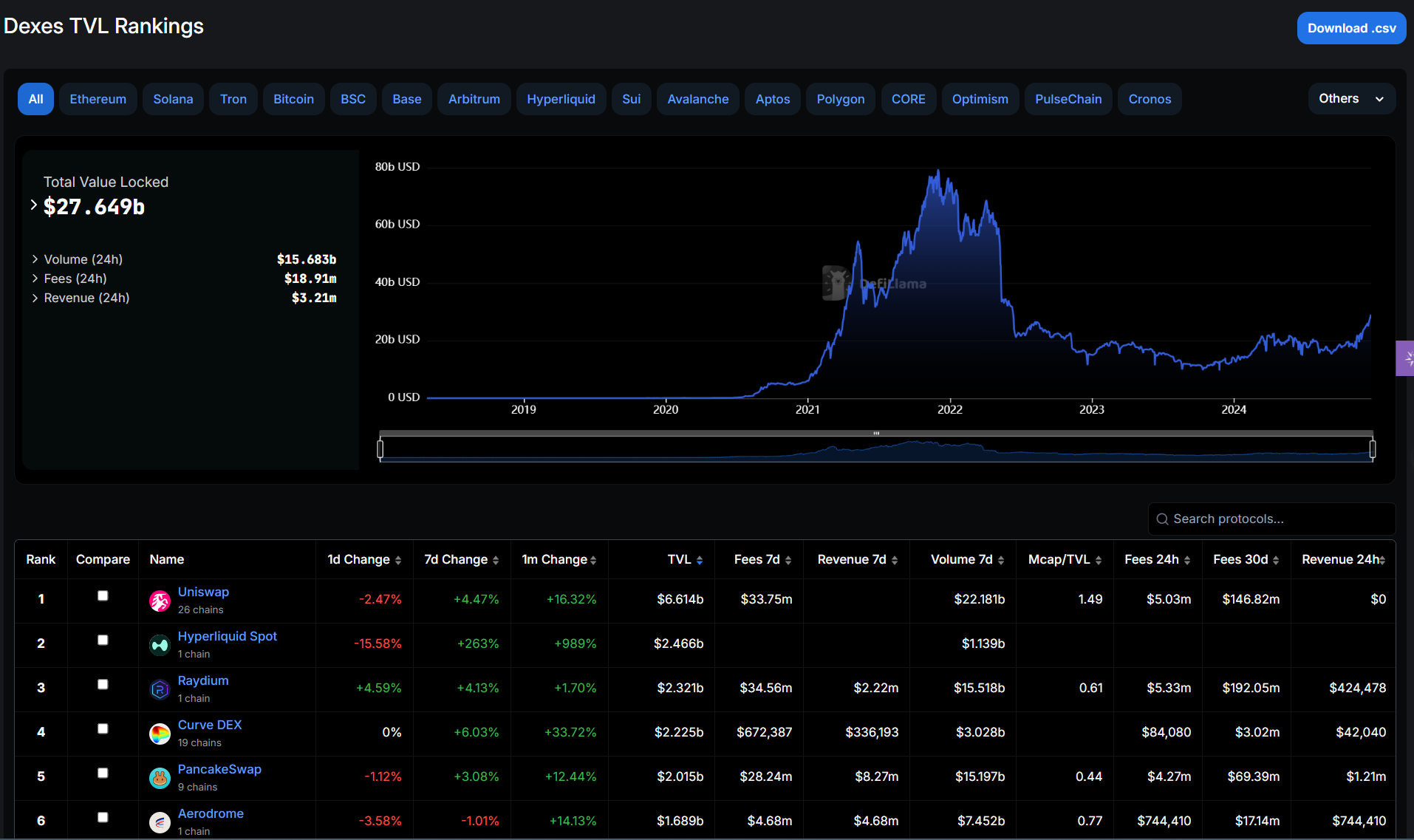 Dexes 总 TVL 为:$27.6 Billion,其中