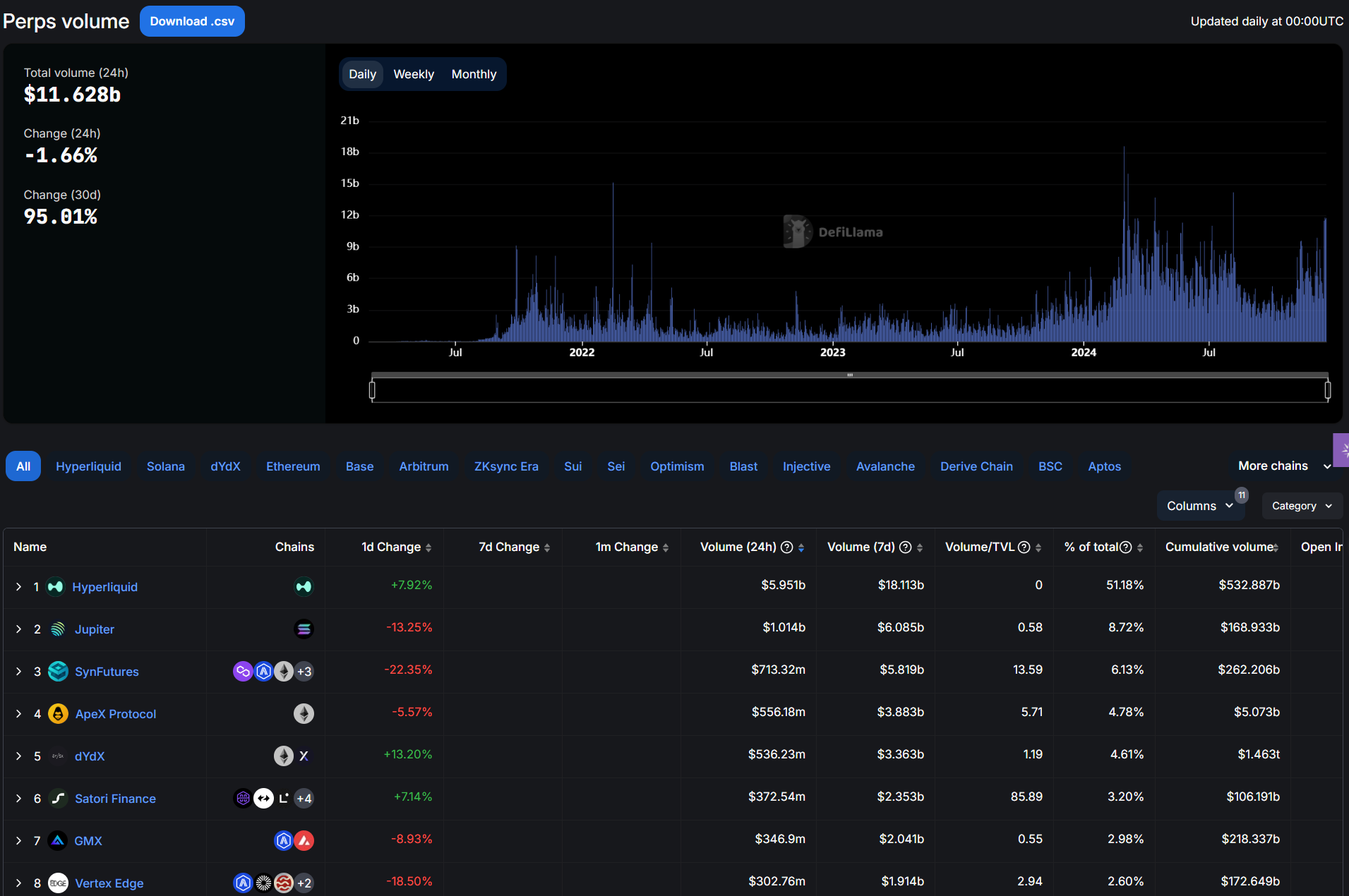 在所有的链上期货交易市场中,Hyperliquid 交易量排名第一,最近 24h 内交易量达到 59.5 亿美元,平台总交易量累计达到 5328.8 亿美元。