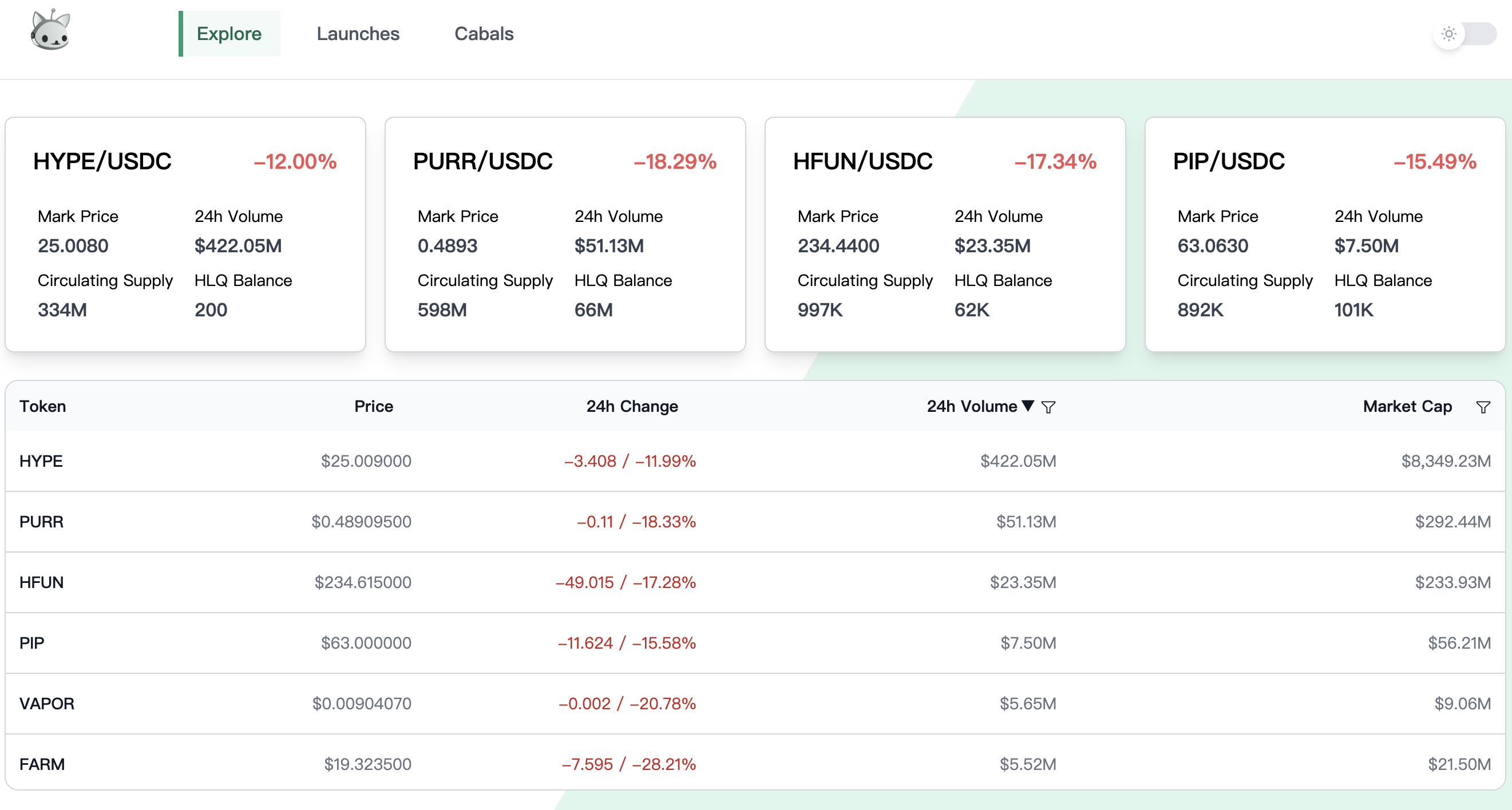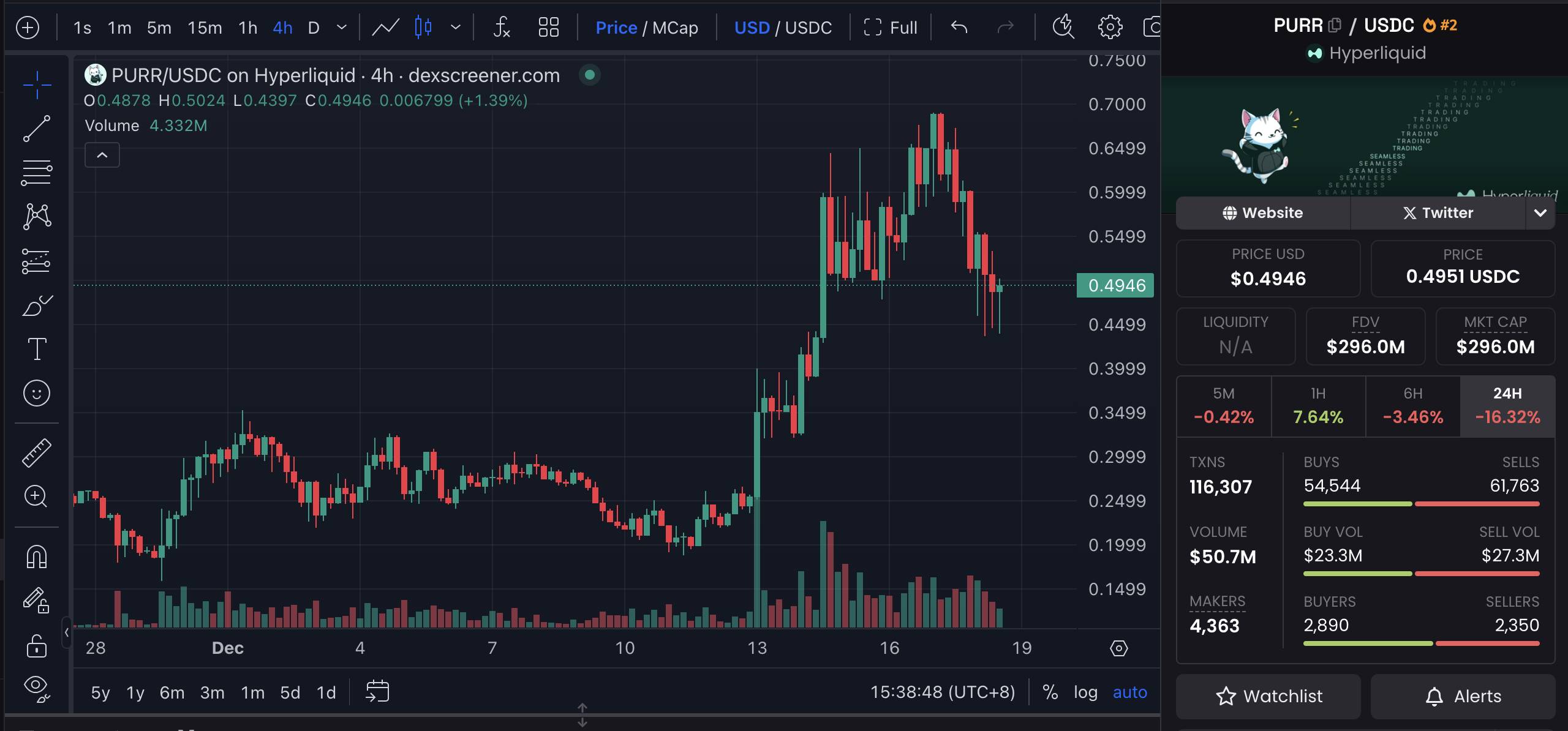 PURR 是 Hyperliquid 上第一个执行 HIP-1 标准的本地代币,一个以猫为形象的 Meme 币。该代币没有进行初始销售,而是将 50% 的代币按照积分持有比例空投给用户,剩余的 50% 被加入至 PURR/USDC 的资金池当中(随后在社区的建议下,40%的代币被销毁)。截至 12 月 18 日,PURR 的市值约为 2.96 亿美元,可谓是 Hyperliquid 上的官方 Meme 代币,社群共识度高。