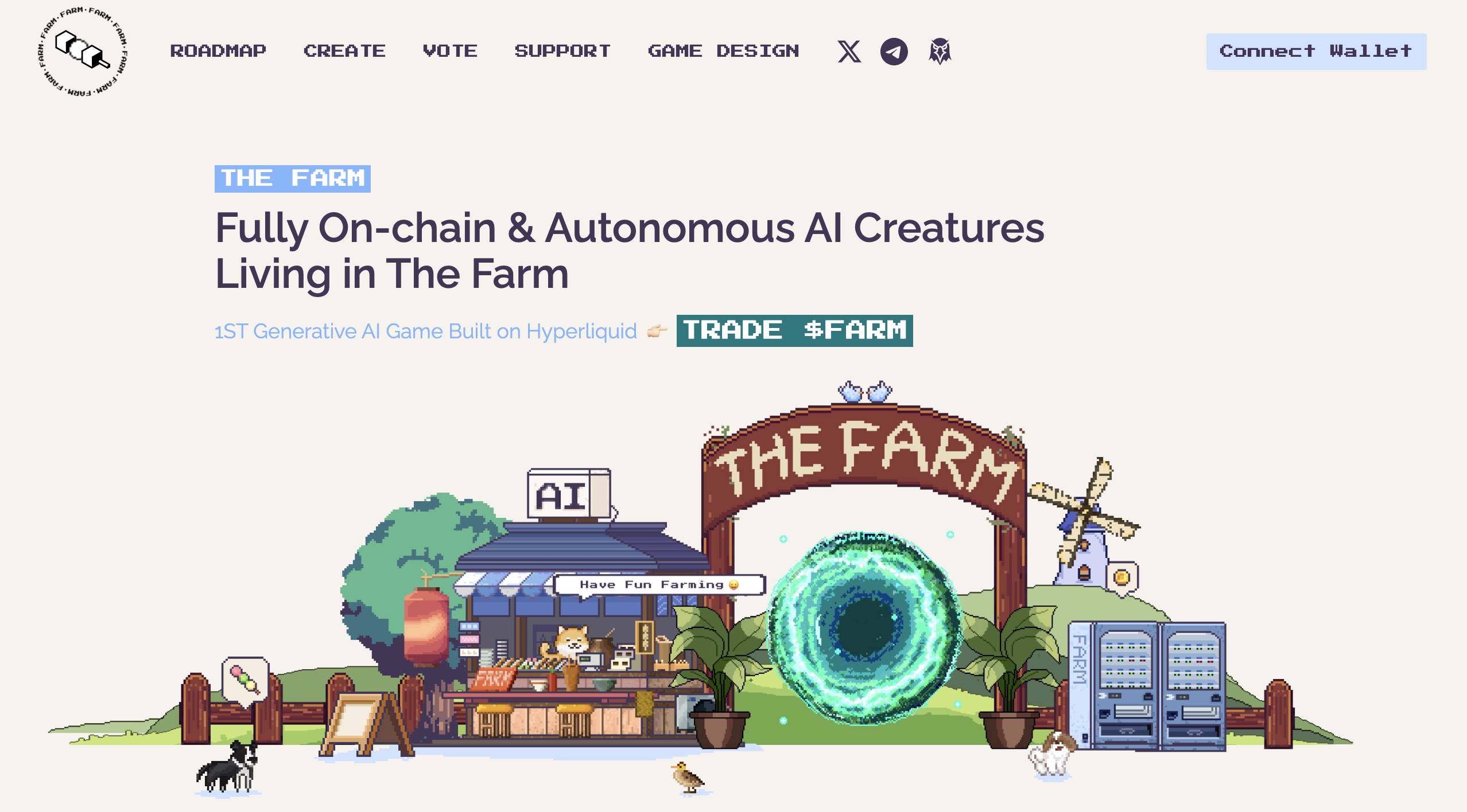 FARM 是第一个建立在 Hyperliquid 上的 GenAI 相关的 AI agent游戏。通过 Genai 模型(Cryptokitties 2.0) + Stardew Valley(模拟游戏) + Pokemon GO(战斗/电子竞技)支持用户通过 AI 在链上进行生物合成。