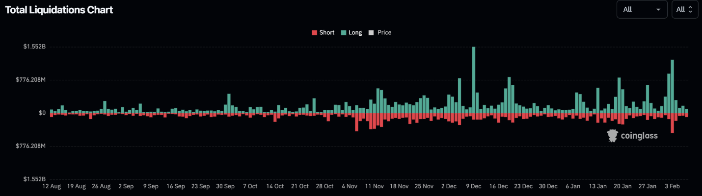 所有资产的总未平仓合约在过去一周内减少了超过 200 亿美元。其中,BTC 合约的名义损失小于 ETH,尽管 BTC 市场规模几乎是 ETH 的两倍。从 2 月 2 日到 2 月 3 日的 24 小时内,未平仓合约总计减少了 140 亿美元。