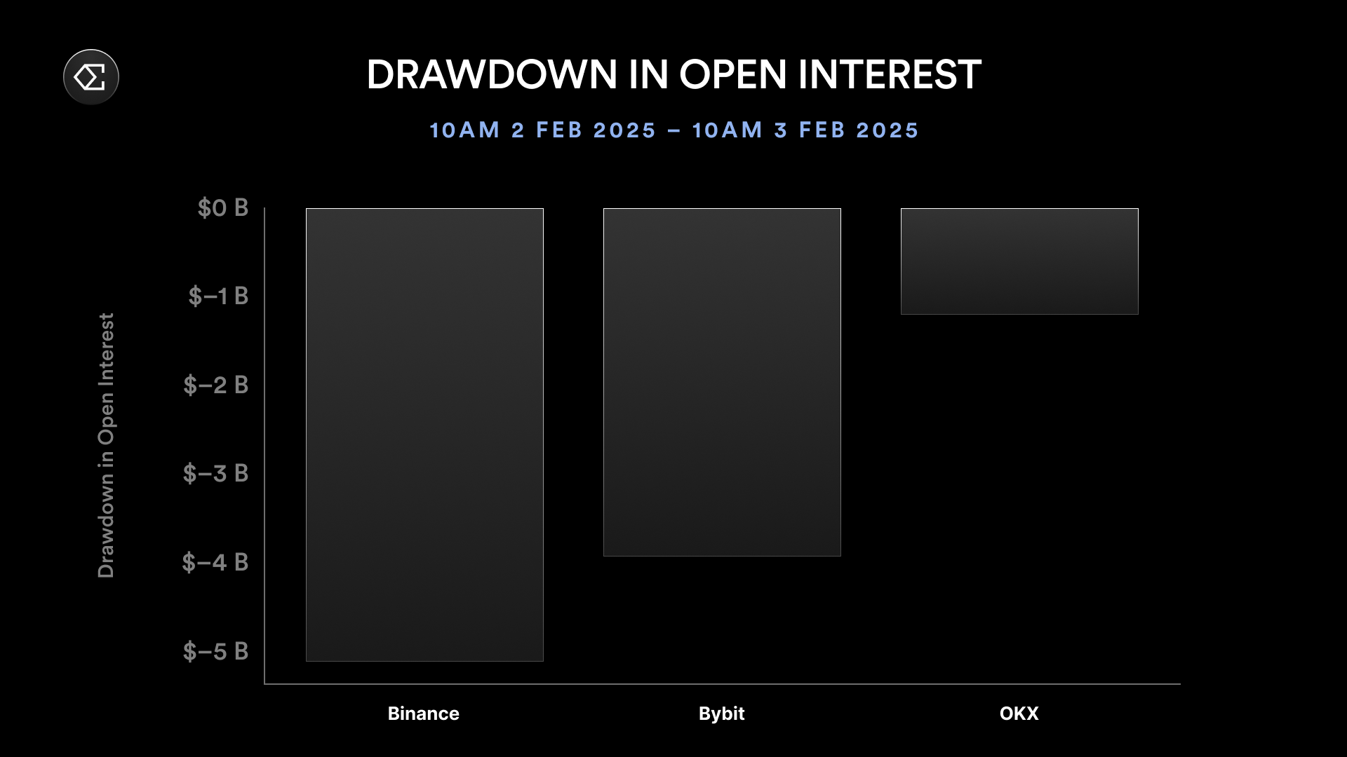 他估计,总清算金额可能在 80 亿至 100 亿美元之间。这一数据更接近各交易所 24 小时内未平仓合约的降幅。例如,从 2 月 2 日到 2 月 3 日,Bybit 的未平仓合约减少了 40 亿美元,而 Binance 则减少了 50 亿美元。
