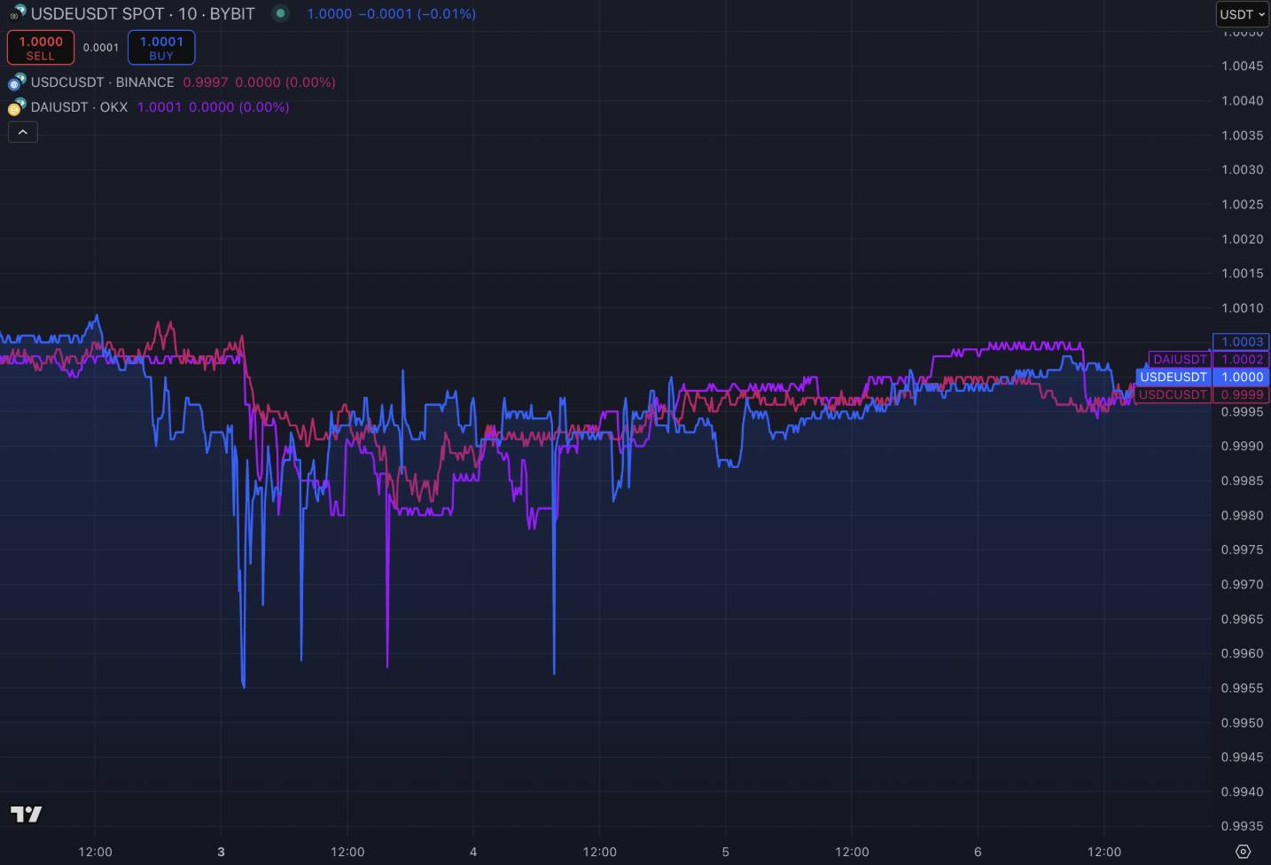 图:USDe 价格 vs USDC(红色)和 DAI(紫色)