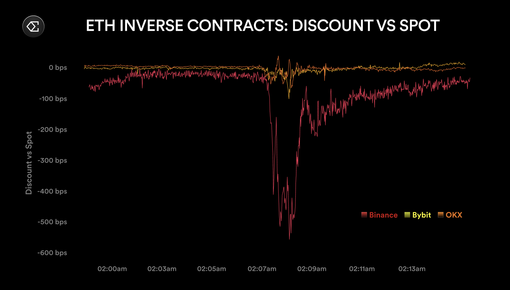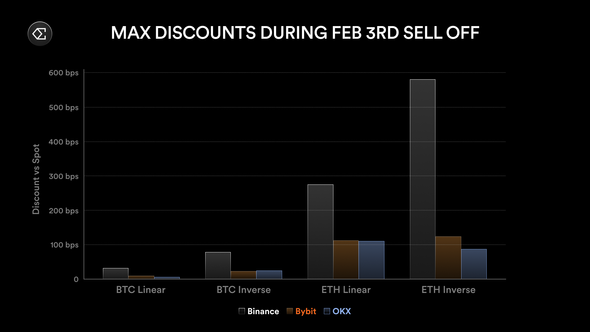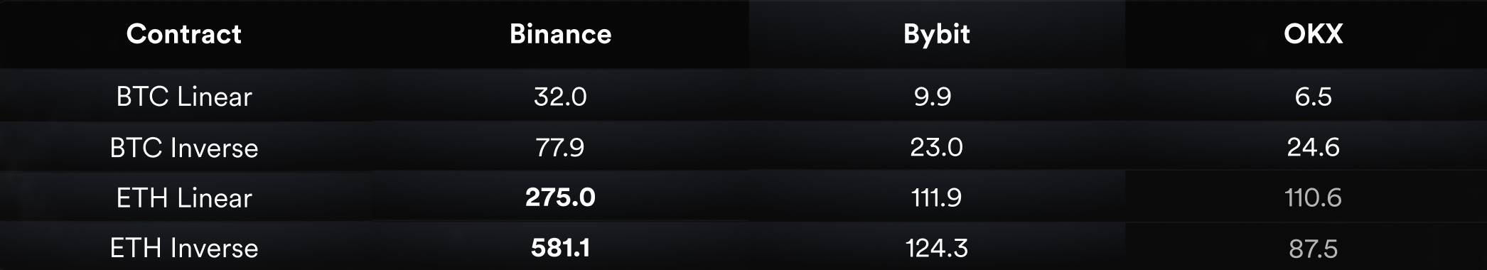 相比 Binance,Bybit 和 OKX 的 ETH 合约折价幅度较小,仅接近 1%。而 BTC 合约在三家交易所的表现普遍优于 ETH 合约,因为此次抛售主要集中在 ETH 合约,尤其是币本位(反向)结算的合约上。