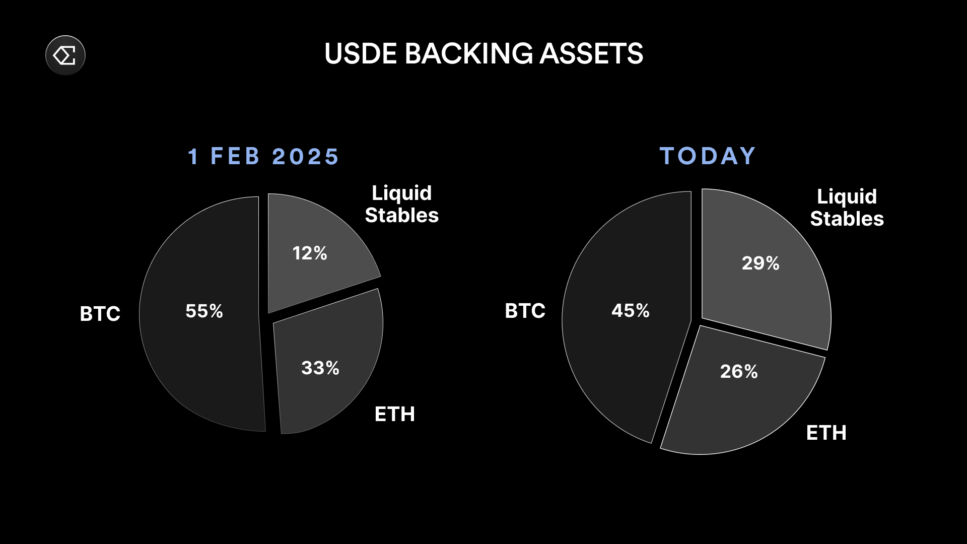 以下对比图展示了 2 月初与当前 USDe 支撑资产的组成变化。USDe 目前有近 18 亿美元的流动性稳定币作为支撑,占总支撑资产的 29%。其中部分流动性稳定币的收益率已超过永续期货的资金费率。只要永续期货的表现不如预期,Ethena 将继续增加流动性稳定币的分配比例,以优化 USDe 的支撑资产结构。
